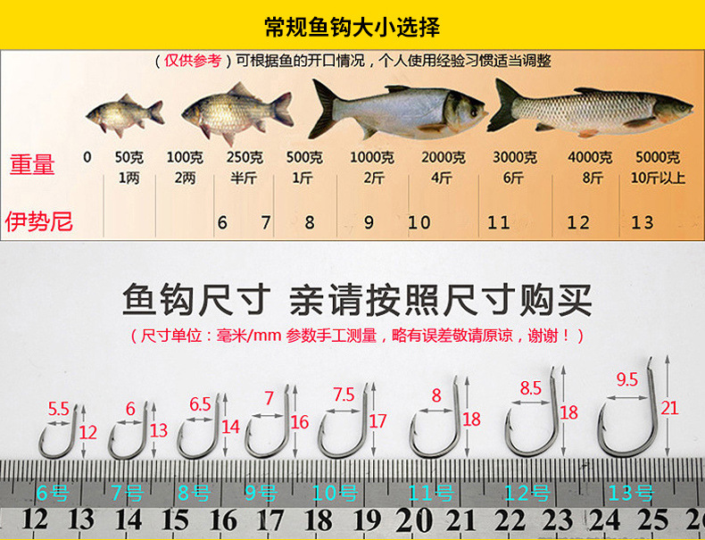 在河流,鱼塘,水库等大水面钓鲤,草,青,鲢等大型鱼,就要选择千又2号,伊势尼9号,丸世12号及国产黑鲤8号,长海921号以上的大钩,倒刺分明,钓钩尖端到倒刺的距离不要太长,如果垂钓的对象是罗非鱼,白鲳,红梢等肉杂食性凶猛鱼,就应该选用稍大些的长柄钩,如长海312-315号,丸世13-19号,溪流9-12号或伊势尼12-14号及千又3号以上的大钩。