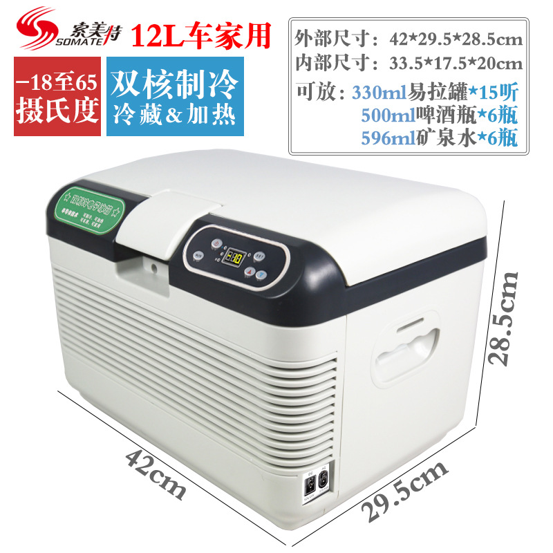 致亲们:这款12L大容量双制冷冰箱,双核制冷即有两套半导体冷片制冷系统,是普通单核小冰箱制冷速度和降温效果的两倍, 这款双制冷冰箱适合所有12V和24V的车用电源使用以及220V的家用电源使用,小轿车、大卡车和家庭使用均可,基本不受环境限制!液晶温度控制面板温度可调恒温,是冷藏胰岛素、中药、疫苗、高档女用化妆品护肤品、红酒、洋酒、鲜肉、海鲜等冷藏要求较高产品使用,30度以内环境温度冰箱内部导入500-1000毫升水插电运行一晚上次日早上冰箱内基本可以结一层薄冰哦!!效果非常不错!!
