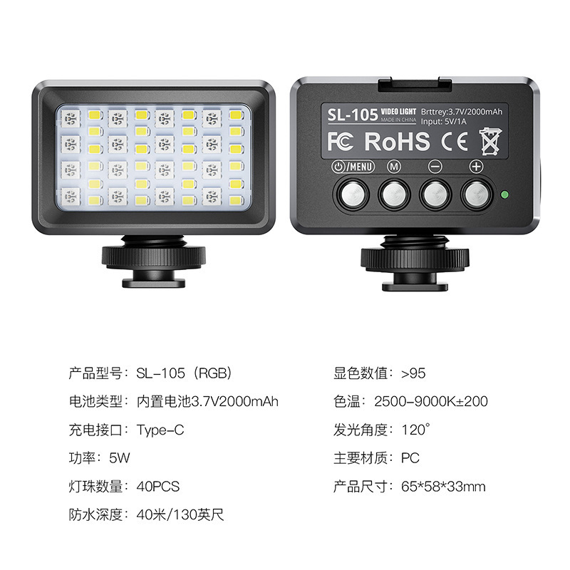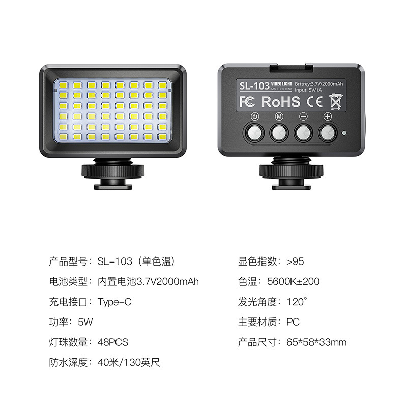 外光设计简单大方小巧,更加方便安装,不挡住其他附件使用,深度防水可达60米,适合不同的环境下使用,摄影、视频、水下、娱乐为您的日常生活提供照明、补光