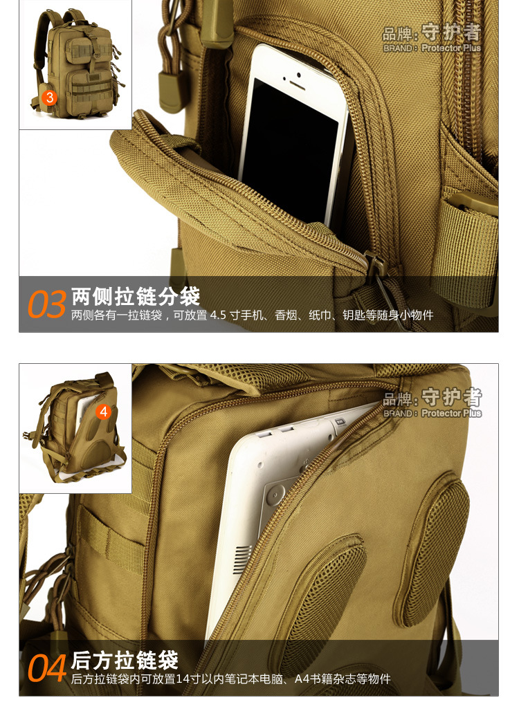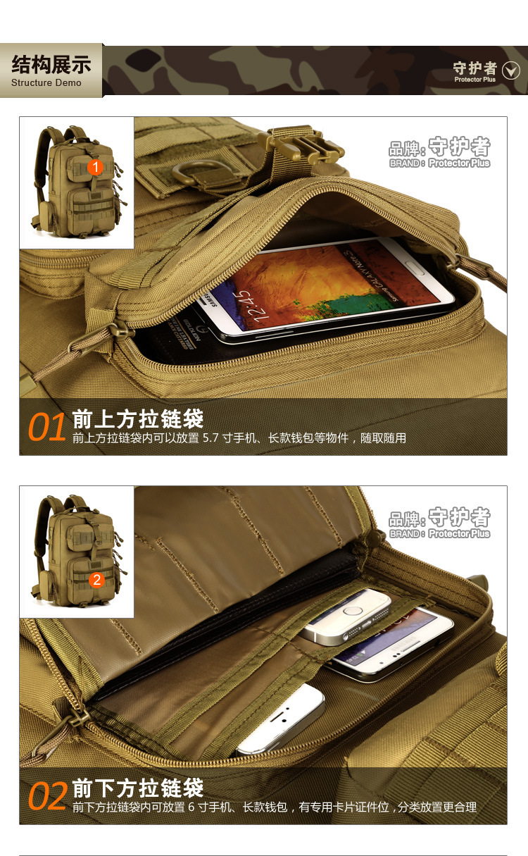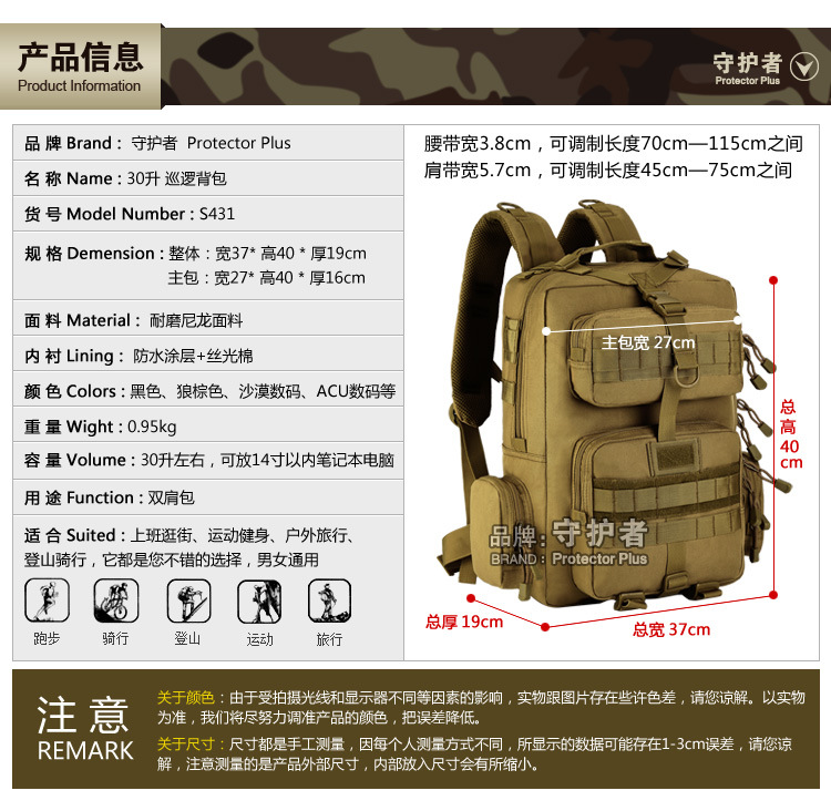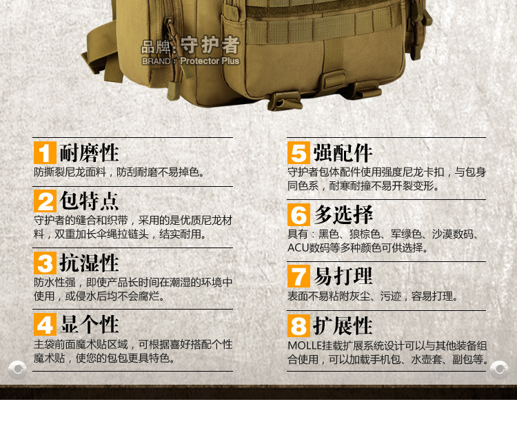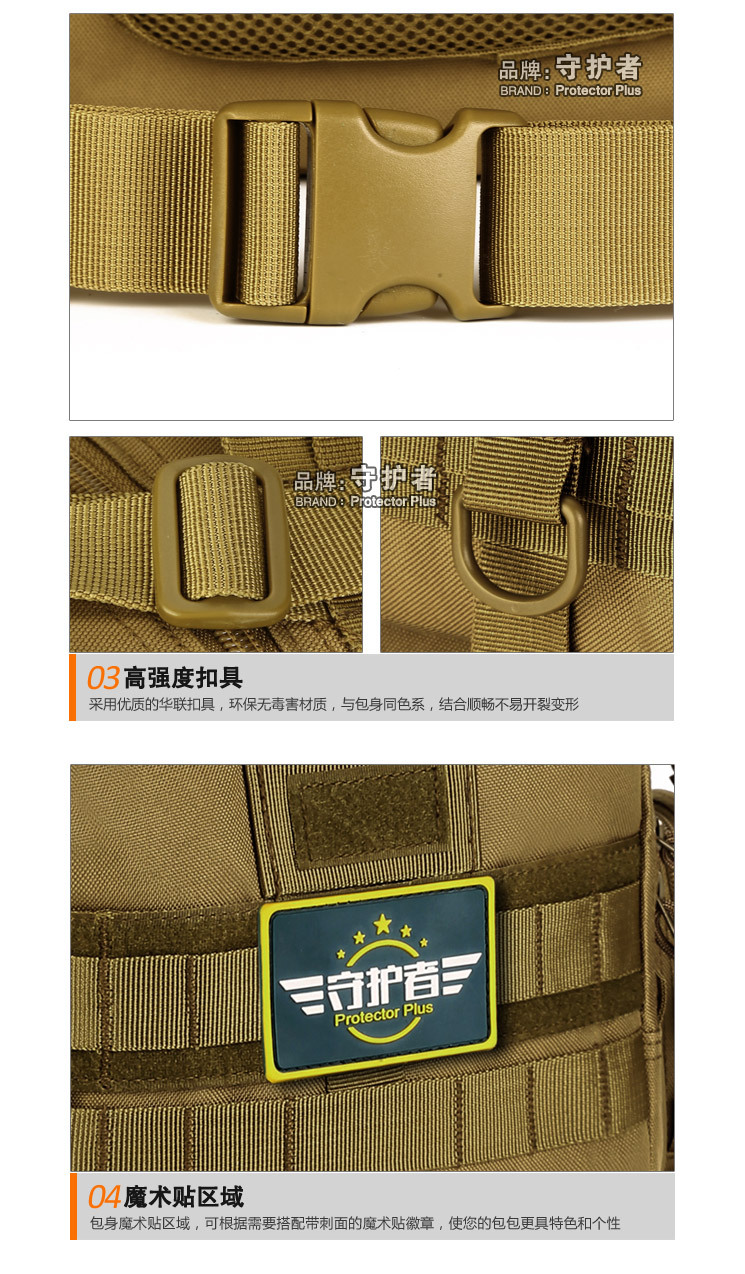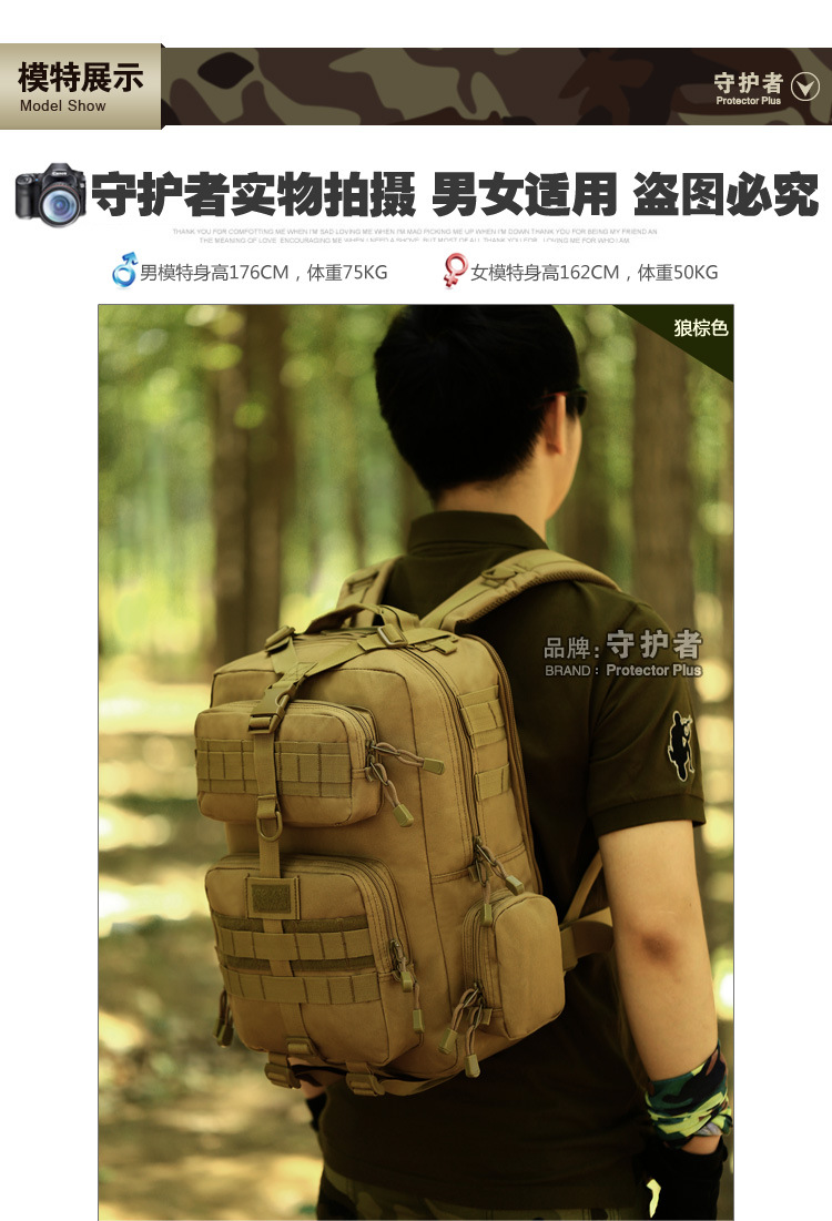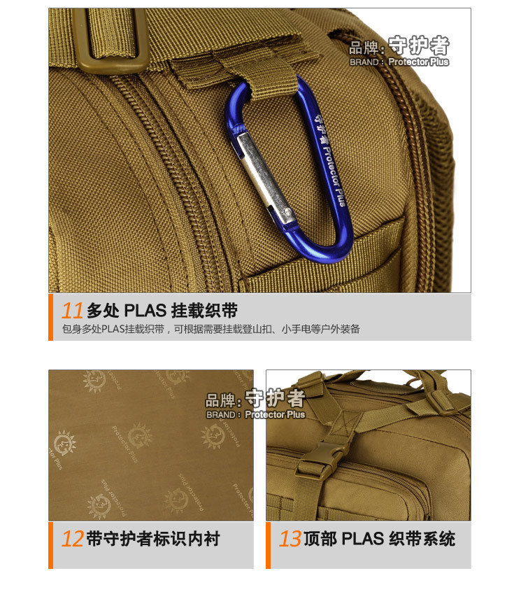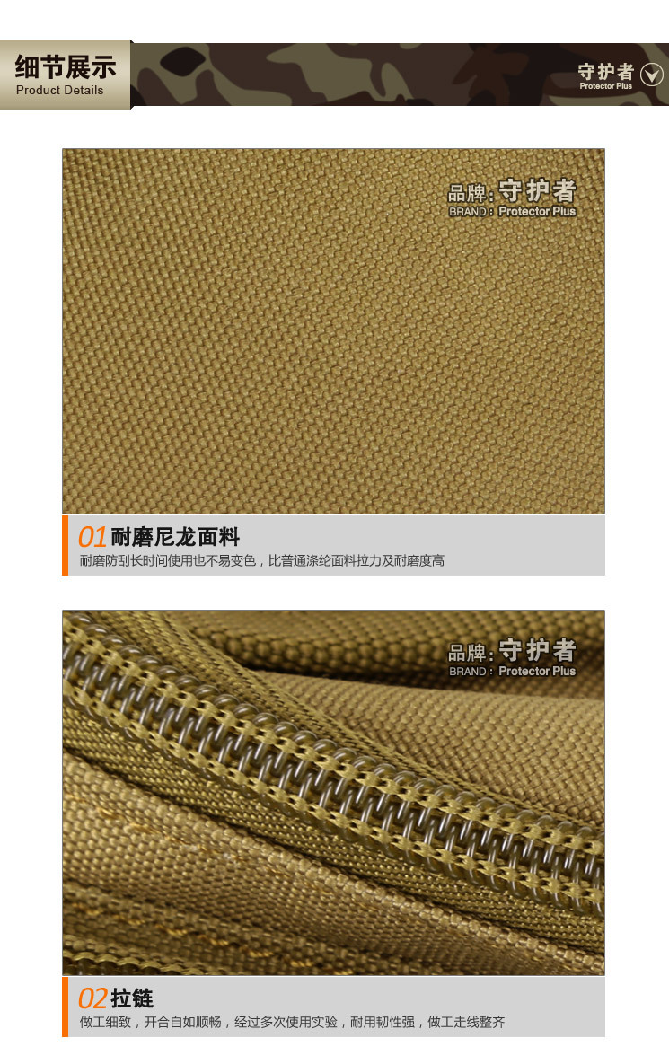 守护者箱包厂是一家专业设计、生产、销售户外背包、腰包、胸包、斜挎包、腰带、背心等产品的诚信经营商家。守护者箱包厂拥有完整、科学的质量管理体系。自设有生产工厂,多名老员工在户外产品领域有着丰富的设计、生产经验,所有材料和配件均质量上乘符合相关标准,我们秉承专业敬业的精神,为客户提供好的产品和服务等优势占有市场,在产品的设计、包装、质量上不断的提升,获得大批客户的认可,产品远销海外。守护者箱包厂专门为国内外贸易公司、实体店、国内外网上店铺(速卖通、EBAY、WISH、亚马逊、天猫,淘宝C店,京东,拍拍)、军迷户外用品商家、箱包行业创业者等供应大量现货。本厂拥有守护者/Protector Plus户外品牌,考虑部分老客户拥有自主品牌,我们的产品除了吊牌没有任何中文标示、您可自定义品牌;并接受来样加工生产、贴牌、定制等,如有任何问题可在线联系我们客服旺旺,如果您对我们的产品有任何感受、想法或建议,欢迎随时提出!