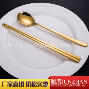 가정용 304 스테인레스 스틸 티타늄 도금 골드 한국식 숟가락과 젓가락 세트 레스토랑 304 스테인레스 스틸 골드 플랫 젓가락 숟가락스토어 가기