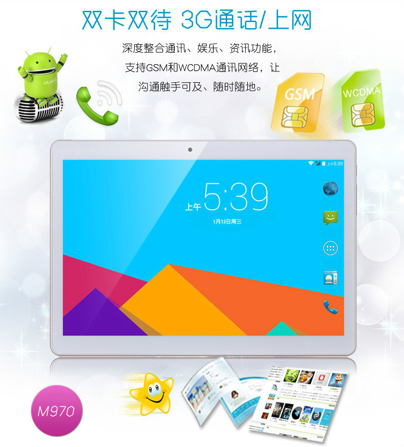 全新纯手写触摸IPS高清1280*800分辨率电容屏平板电脑10.1英寸,高配置1G+16G内存,摄像头前200W+后300W,MTK6582四核。内置无线WIFI网络,内置3G联通上网,联通/移动双卡双待,随时随地冲浪打电话,同时支持视频,3D游戏,高清视频。