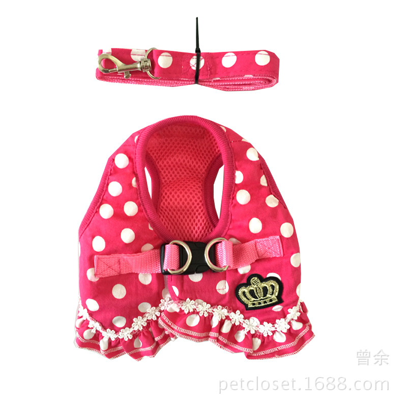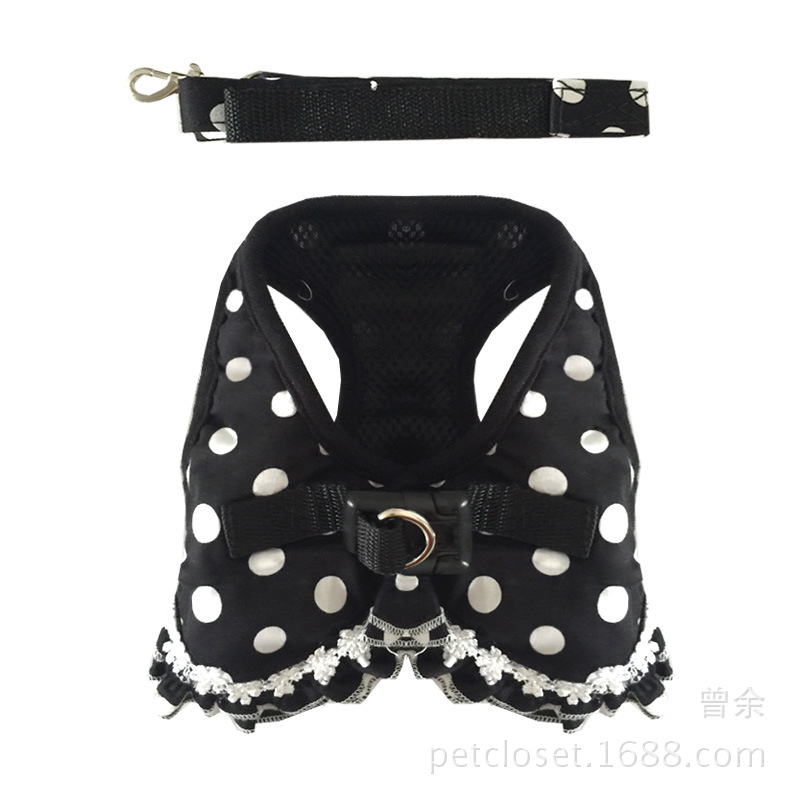 设计:波点小背心式胸背,可爱蕾丝花边,一款胸背多种穿法,即可单独当作小衣服穿,也可当作遛狗神器,配送牵引绳