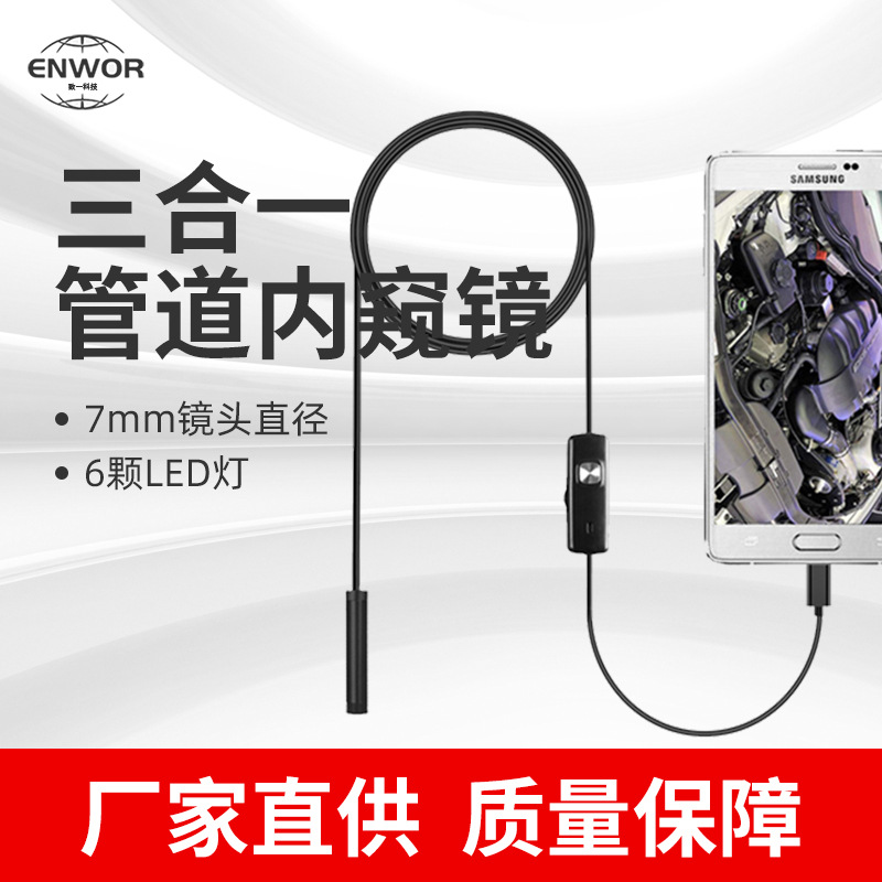 此款内窥镜是直接通过手机的mirco数据接口(也就手机充电口)连接到手机,直接成像在手机上,可对预览的画面进行拍照和录像,是目前使用最为方便的一款经济又好用的内窥镜,通过送的转接线,同时可以在电脑上面使用。