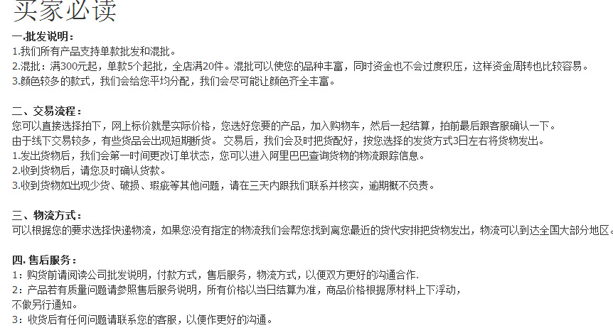 1.购货前请阅读公司批发说明,付款方式,售后服务,物流方式,以便双方更好的沟通合作。