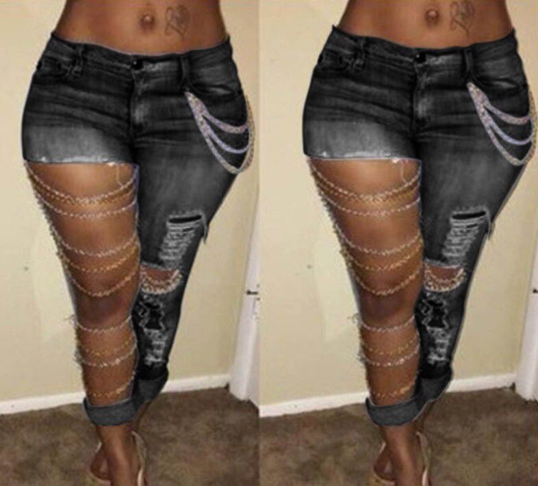 2026년 여름 신상 유럽 및 미국 스타일의 과장된 빅 데미지 데님 팬츠 여성용 슬림핏 신축성 있는 바지 아마존 직배송스토어 가기