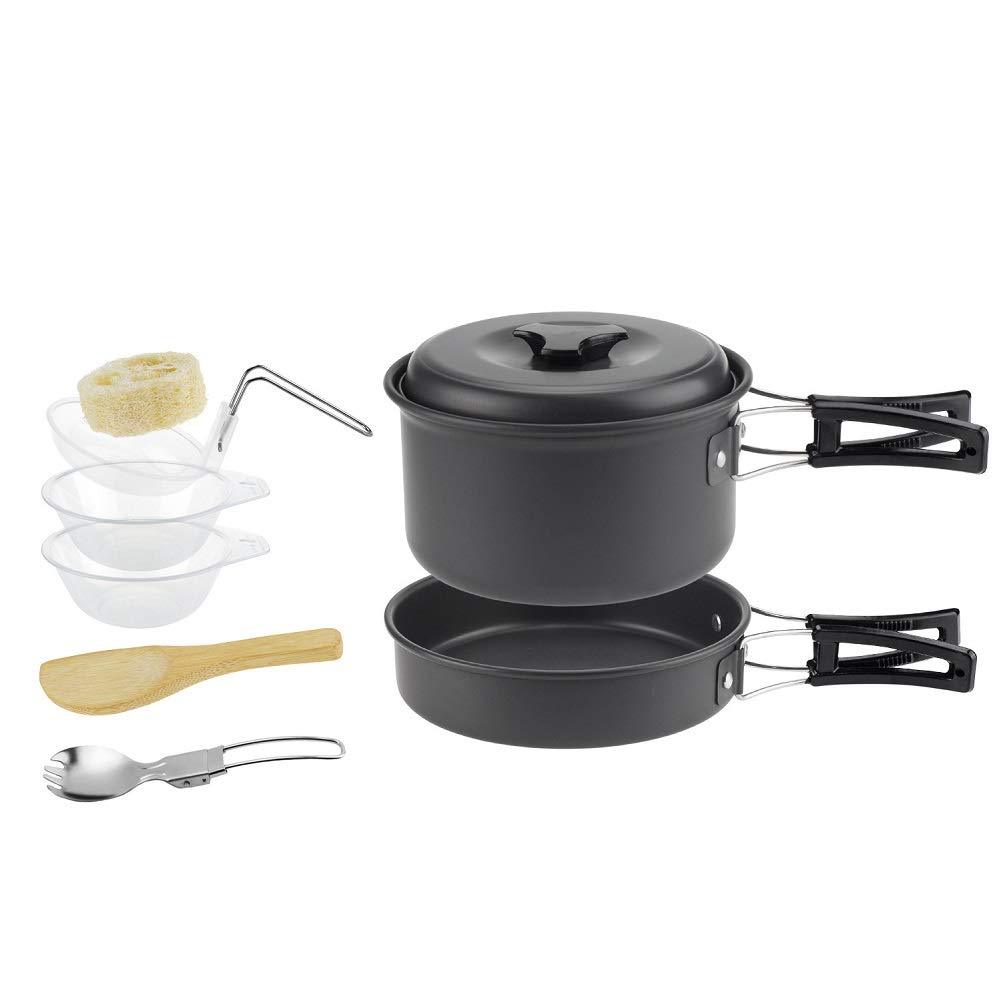 材质:采用优质铝材,高级硬质铝氧化,耐高温,耐磨擦。包括一小锅和煎锅,一汤匙,一饭勺,两小碗,一个清洁球以及一个折叠叉勺(叉勺可单独加)。汤匙,饭勺和碗采用安全食品级PP材质。网袋包装。适合1-2人使用。