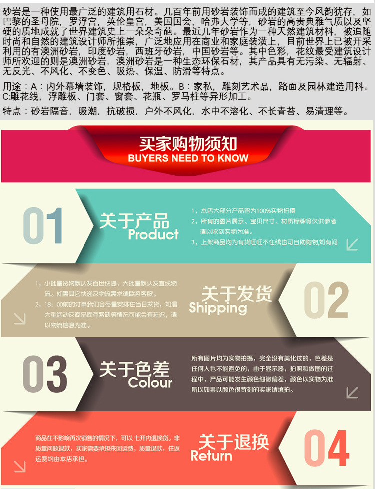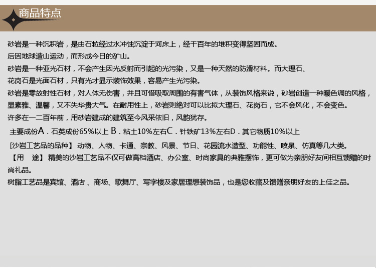 【产品描述】:砂岩是一种沉积岩,是由石粒经过水冲蚀沉淀于河床上,经千百年的堆积变得坚固而成。后因地球造山运动,而形成今日的矿山。 砂岩是一种亚光石材,不会产生因光反射而引起的光污染,又是一种天然的防滑材料。而大理石、花岗石是光面石材,只有光才显示装饰效果,容易产生光污染。 砂岩是零放射性石材,对人体无伤害,并且可惜吸取周围的有害气体,从装饰风格来说,砂岩创造一种暖色调的风格,显素雅、温馨,又不失华贵大气。在耐用性上,砂岩则绝对可以比拟大理石、花岗石,它不会风化,不会变色。许多在一二百年前,用砂岩建成的建筑至今风采依旧,风韵犹存。