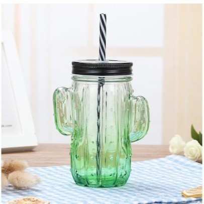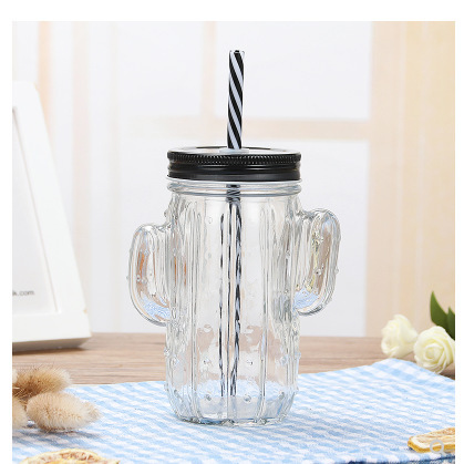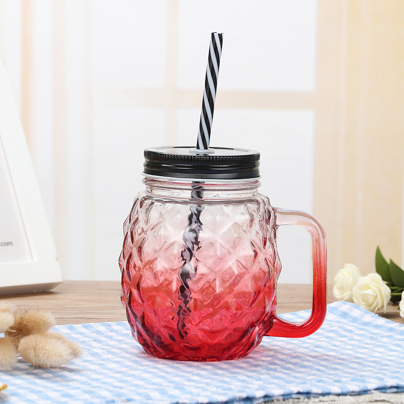 젖빛 주스 수탉 컵 그라디언트 컬러 편지 유리 투명 뚜껑 빨대 차가운 음료 핸들 메이슨 컵스토어 가기
