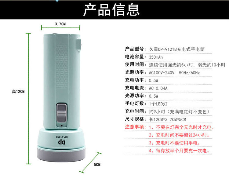 产品充电时切勿使用,以免烧坏LED灯或电源内部充电部件。