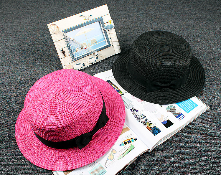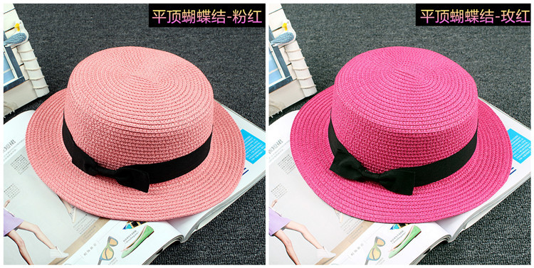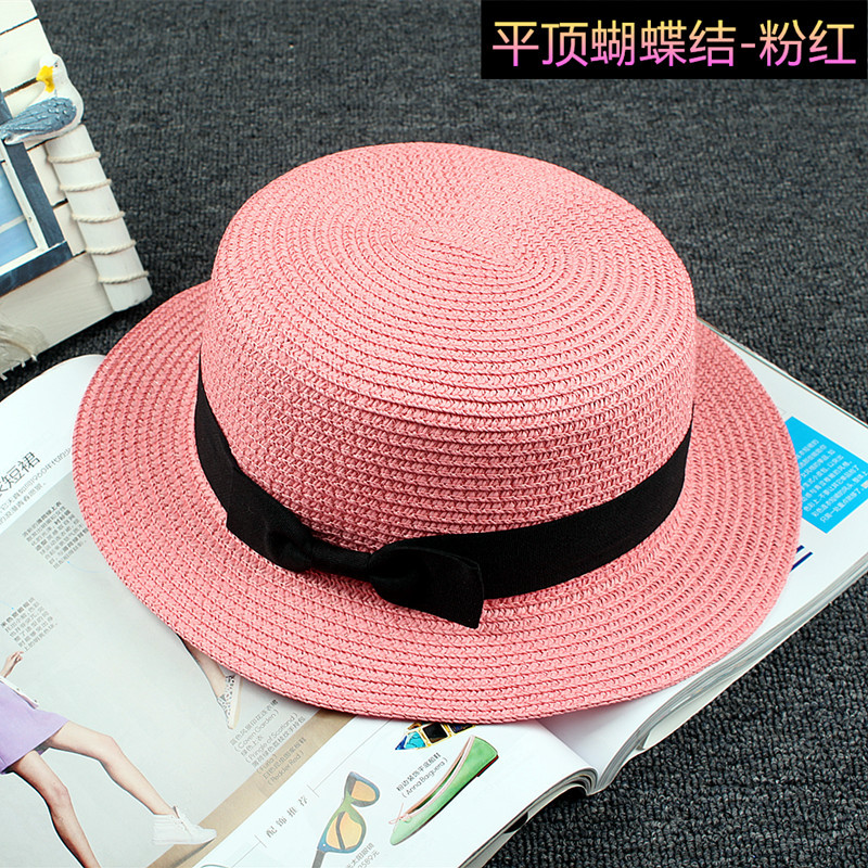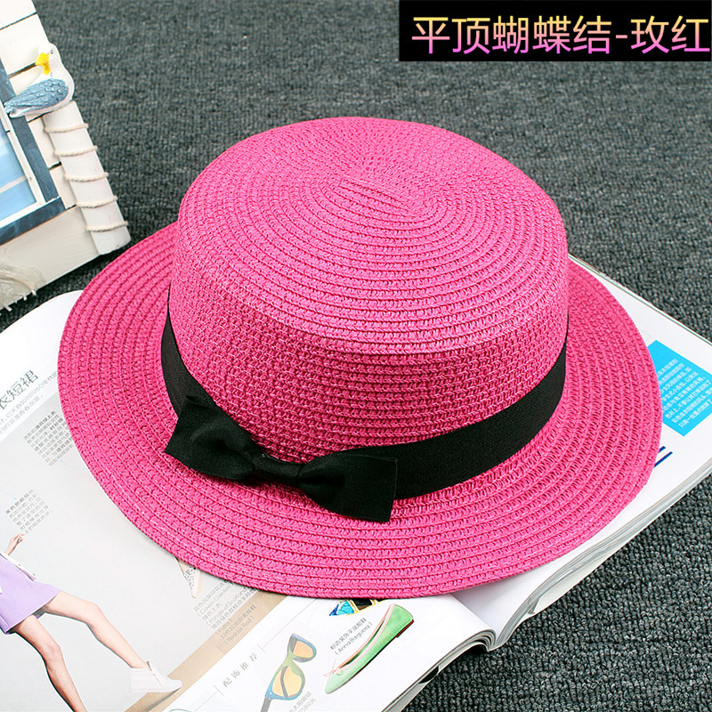 • 플랫 탑 보우 밀짚 모자 로즈 레드