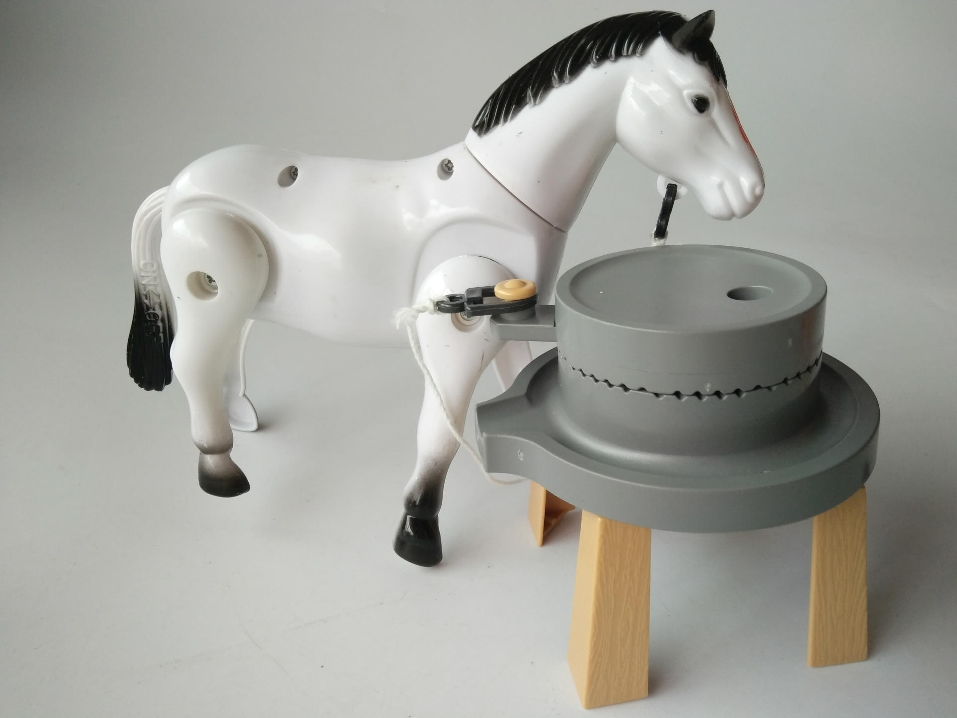 装入一节5号电池,用手向上抬一下马儿的尾 巴,马的4 条腿会像真的一样跑起来,另附有趣味磨盘,绳子一头系在磨盘上,另一头系在马的嘴 角处,这样马会以树桩为中心来回转圈。还有 种玩法,宝宝可以直接牵着绳子在前面走,让马跑起来吧。