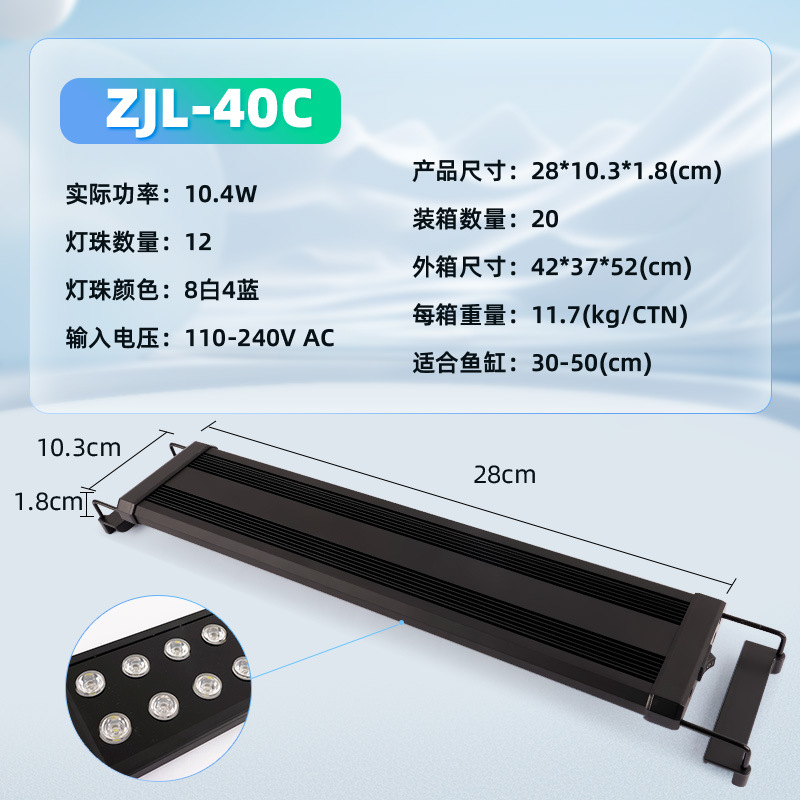• ZJL-40C 수생식물 브래킷 램프(흰색 8개, 파란색 4개, 램프 구슬 12개, 30-50cm 수조에 적합) 고휘도 파란색과 흰색 모델-10.4W