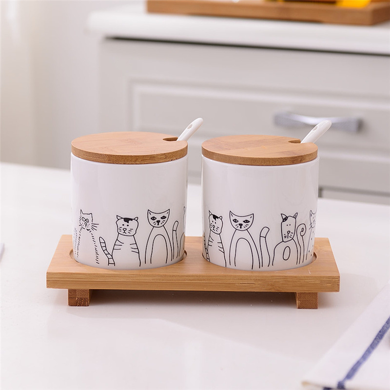 • 나무 패드와 스푼이 포함된 고양이 스타일 직선형 조미료 용기 2개