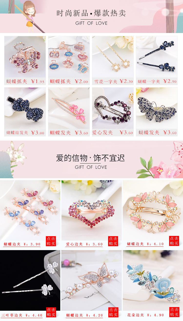 韩国新款水钻猫眼石蝴蝶小抓夹金属爱心蝴蝶结发夹小号鲨鱼夹发饰
