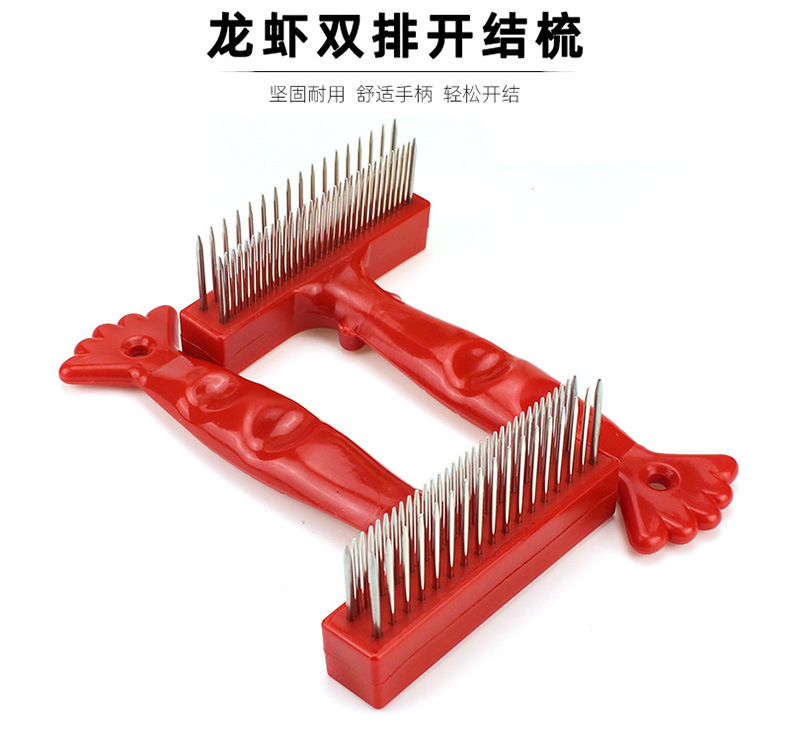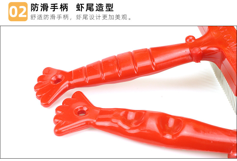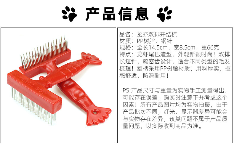 【商品描述】:龙虾尾巴造型,外观新颖,时尚可爱!双排长短针,疏密齿设计,适合不同类型的毛发梳理!塑柄采用优质PP材质,用料厚实,握感舒适!