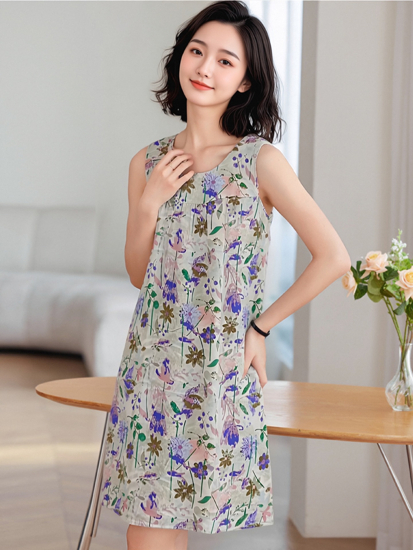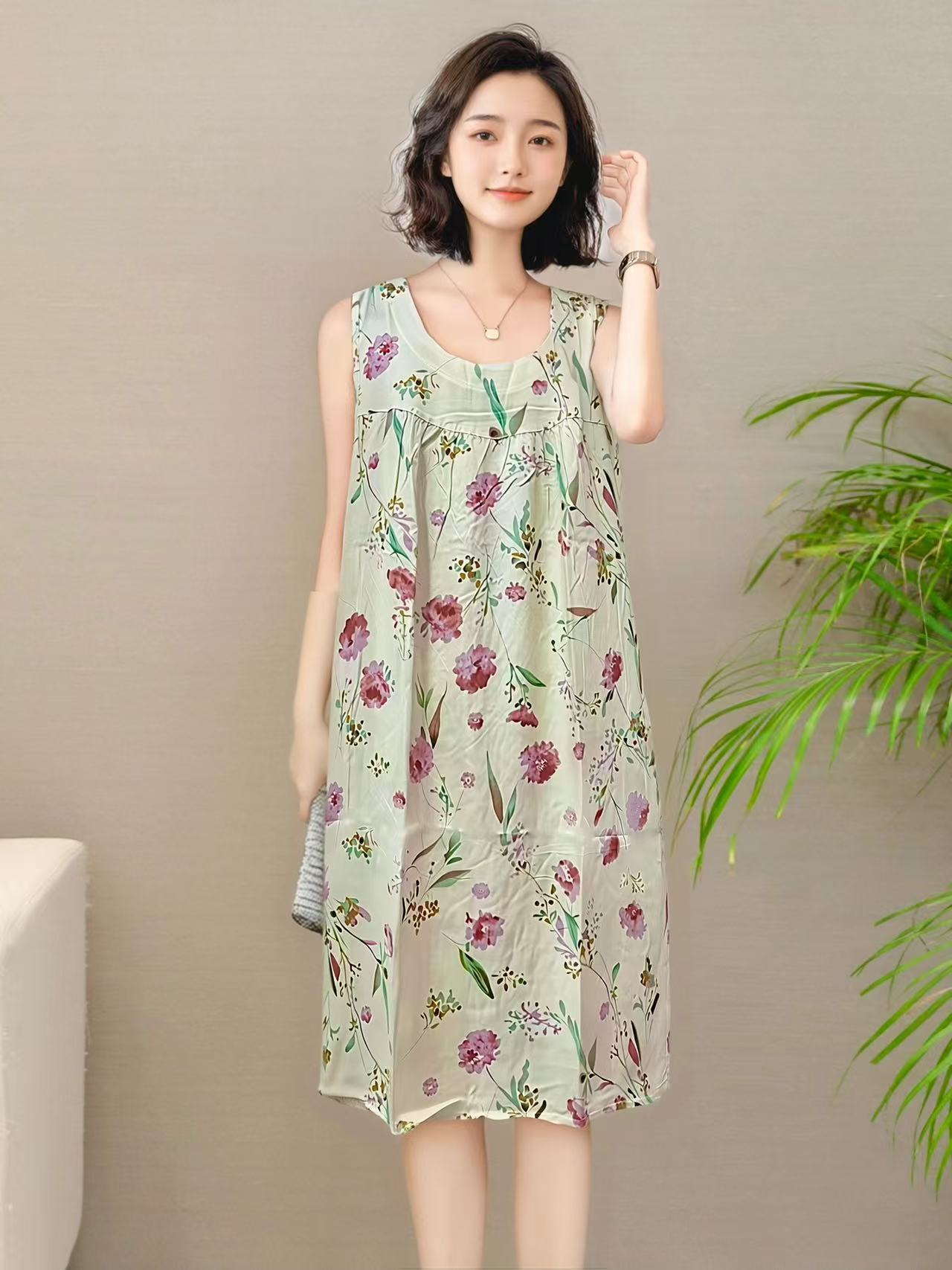 중년 및 노인 여성을위한 여름 잠옷 순수 코튼 실크 어머니의 잠옷 여름 성인 대형 코튼 실크 드레스