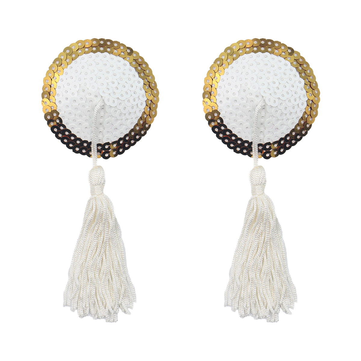 • 흰색 스팽글 황금 가장자리 흰색 술