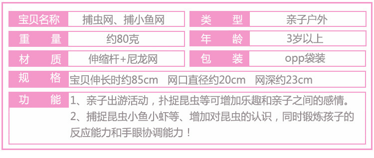 产品规格:总伸长85厘米左右,缩后38厘米左右,网圈直径约20厘米,网深约22厘米.