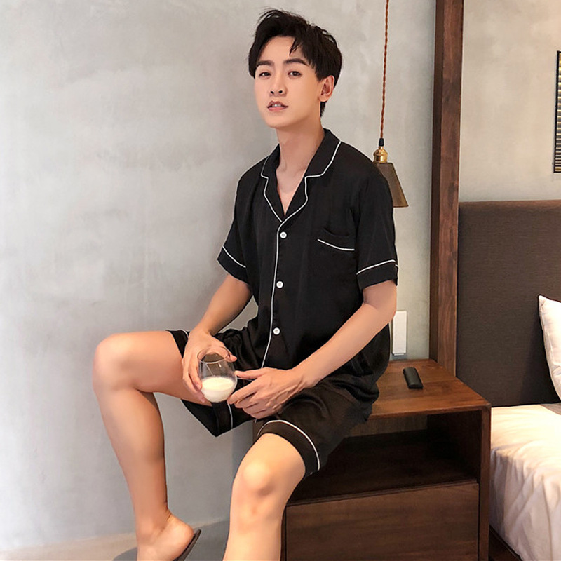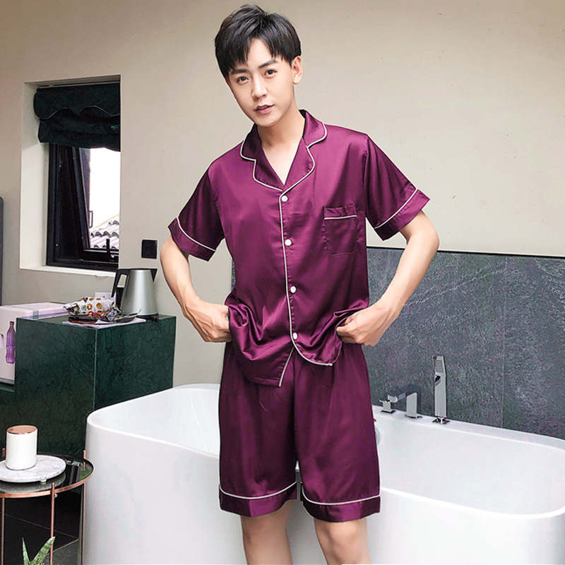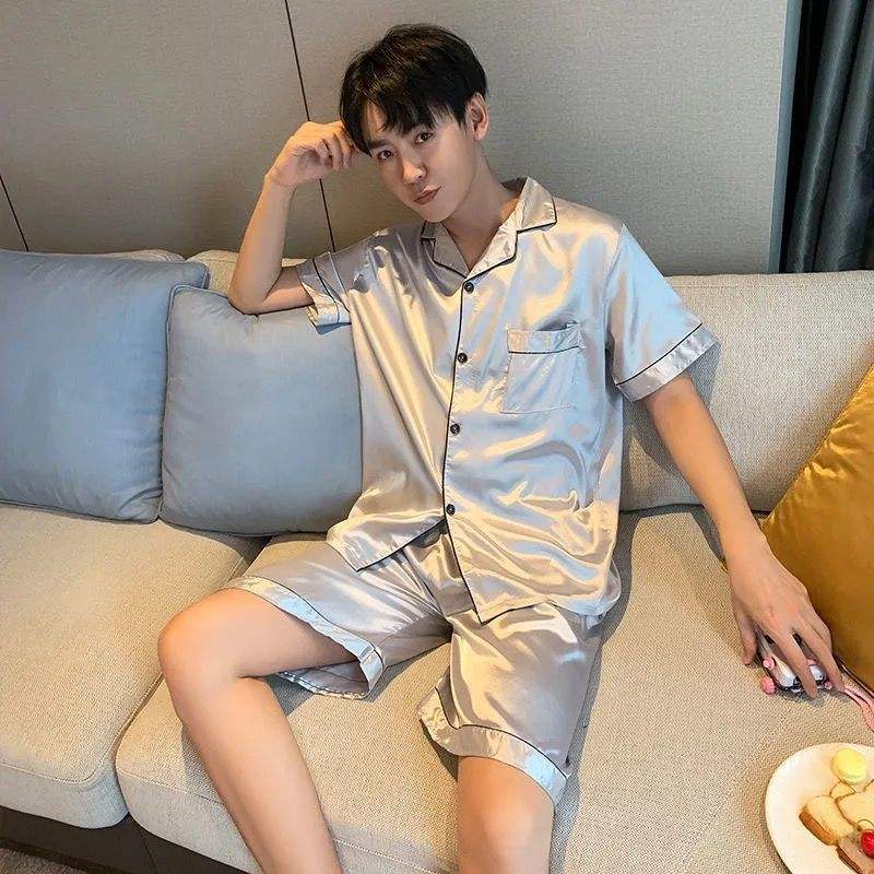 남자의 잠옷 여름 얇은 반팔 반바지 아이스 실크 느슨한 뚱뚱한 플러스 사이즈 200 진 실크 카디건 가정 의류스토어 가기