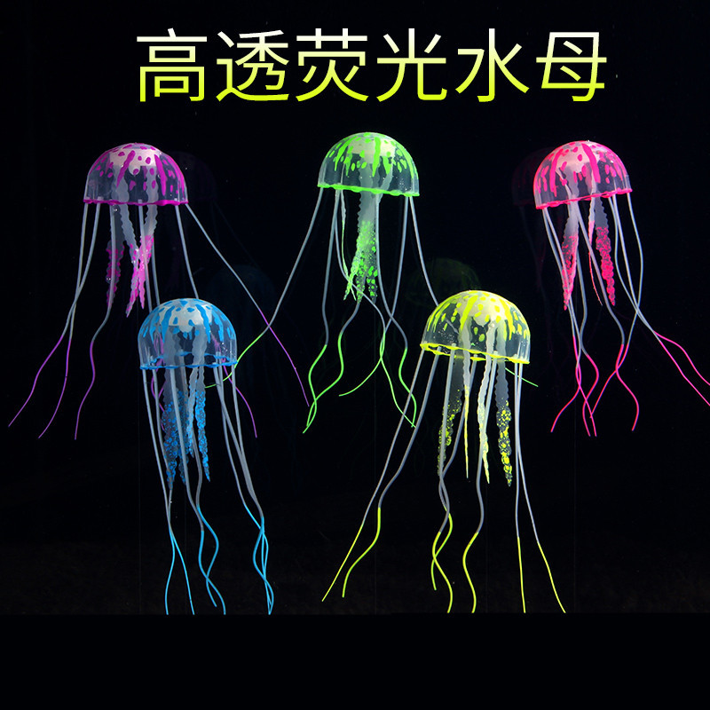 【商品特点】高品质硅胶水母,色泽靓丽,图案清晰,透明度高。此仿真水母不是夜光,漆黑环境下自身不会发光,需要配合鱼缸灯照射才有荧光效果,颜色很漂亮。店长推荐用蓝色和紫色鱼缸灯,其次白色灯。