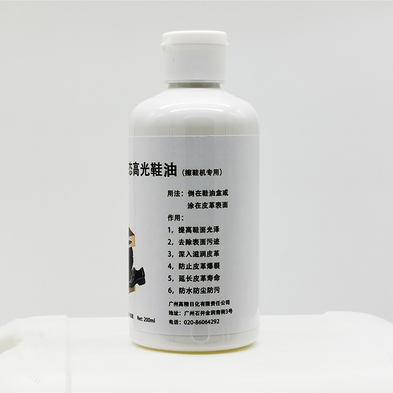 这个液体鞋油是属于水包油型的,常备有透明黑色棕色三个颜色,专用于擦鞋机的护理鞋油。他有明显的光泽及清洁作用,护理滋润皮革表面,防止皮革表面开裂,增添表面手感,拒水防尘,光泽持久。
