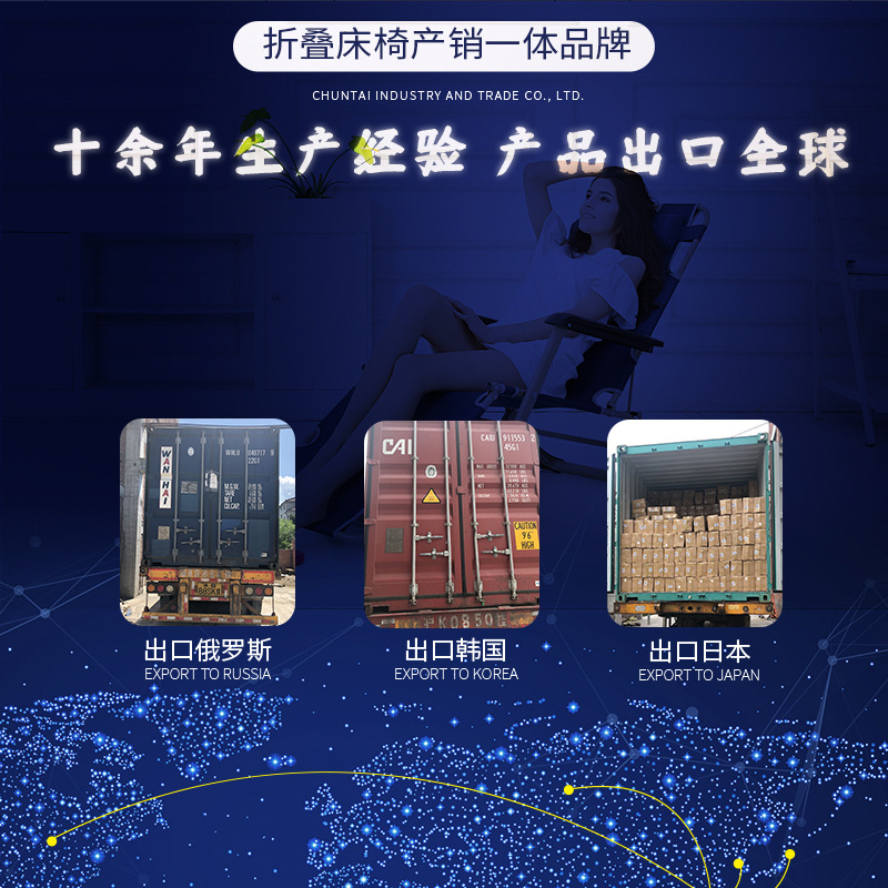 我公司是一个综合性的产品生产公司,主营户外折叠用品,办公折叠午休床,折叠躺椅等。现已经远销韩国、日本、美国等多个多家。