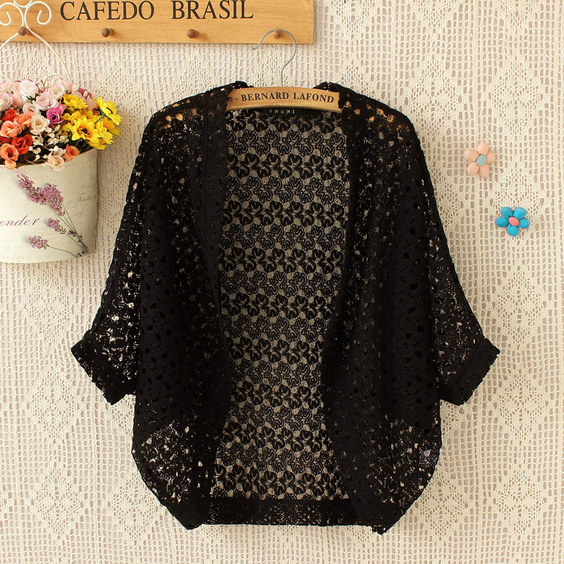 여름 크로 셰 뜨개질 중공 얇은 카디건 외부 에어컨 셔츠 박쥐 중공 니트 셔츠 반팔 여성용 중간 길이 그물 셔츠