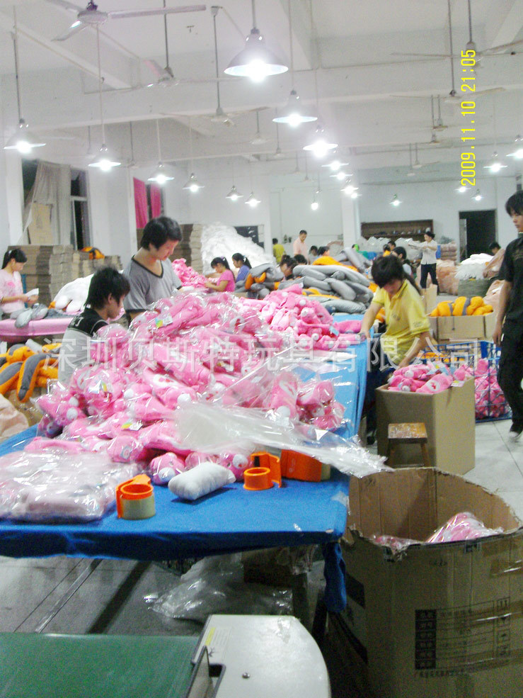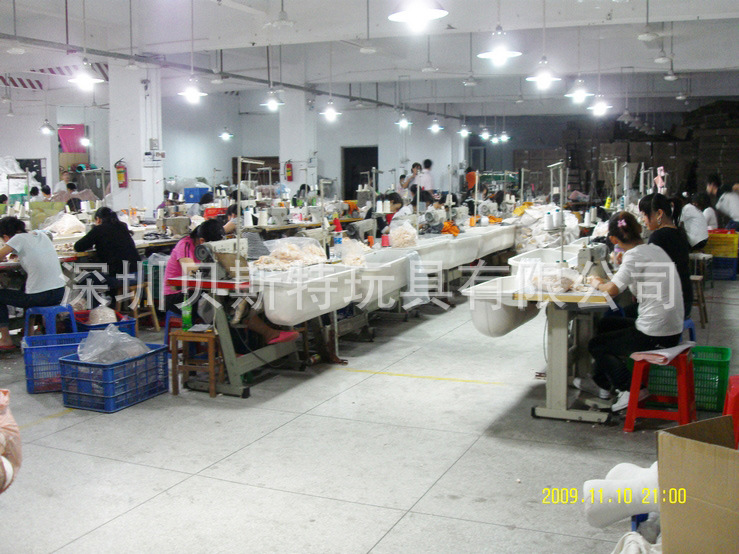 深圳贝斯特玩具厂始创于2006年,经过十多年的打拼,公司由原来单纯的工厂加工发展成现在集开发、设计、生产、销售于一体的综合性企业。工厂占地1600多平方米,分别为销售部、采购部、财务部、设计部、车缝部、手工部、包装部,其中仅生产车间就1000多平方米。公司设备齐全,人员匹配到位,有很强的生产保障能力。其中裁床2台,电剪2台,松棉机1台,充棉机2台,空压机2台,验针机1台;版房师傅3人,车位80余人,手工25人,QC有8人,员工技术精湛,操作娴熟,管理人员都有五年以上工作经验,具有优秀的管理能力。