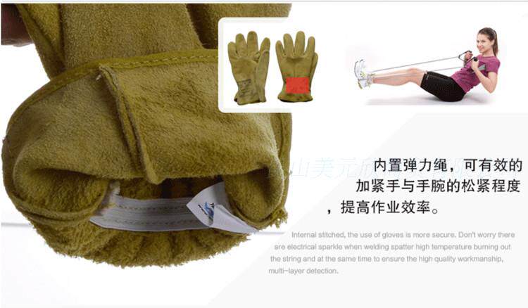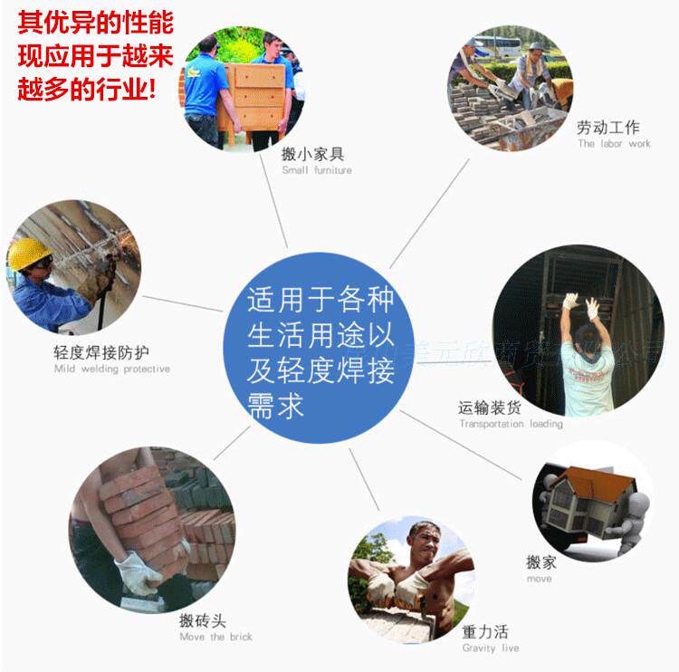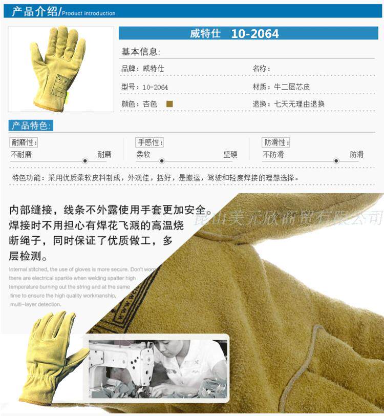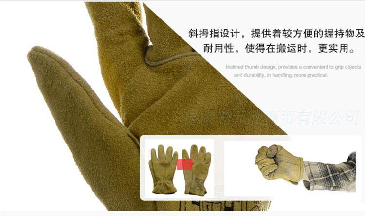 【特点】采用优质柔软牛二层芯皮所制,外观佳,手感好,是搬运、驾驶和轻度焊接的理想选择。