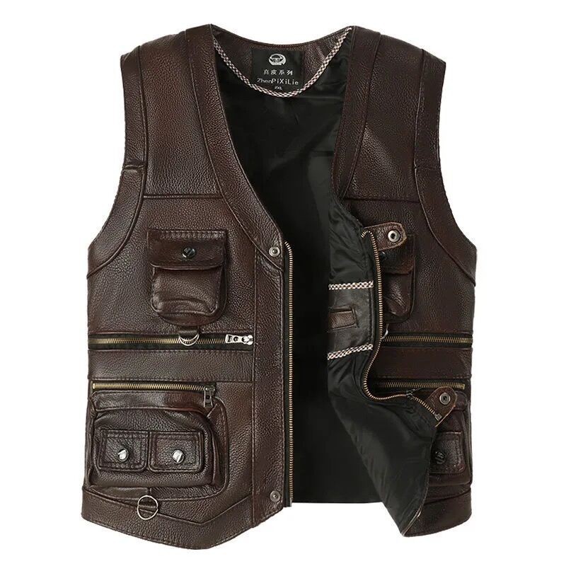정품 가죽 조끼 남성용 첫 번째 레이어 소가죽 리포터 의류 낚시 조끼 야외 따뜻한 가을과 겨울 중년 및 노인 멀티 포켓 아빠 옷