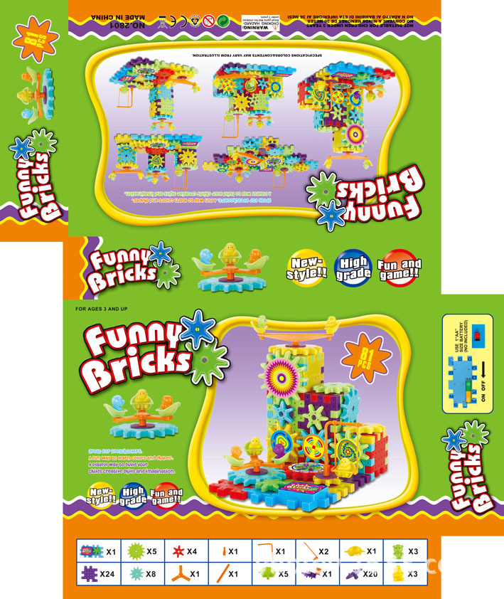 产品说明:一盒内含81个零件,儿童可以根据自己的想象组合成各处不同的形状,如会动的小火车,会动的小坦克,会动的小汽车,会动的小房子,会动的机器人,会动的插笔筒,还有小熊,小猴子在乐园里玩摩天轮,翘翘板,荡秋千,加上可爱的各种图案,简直就是一个盛大的超级乐园!!
