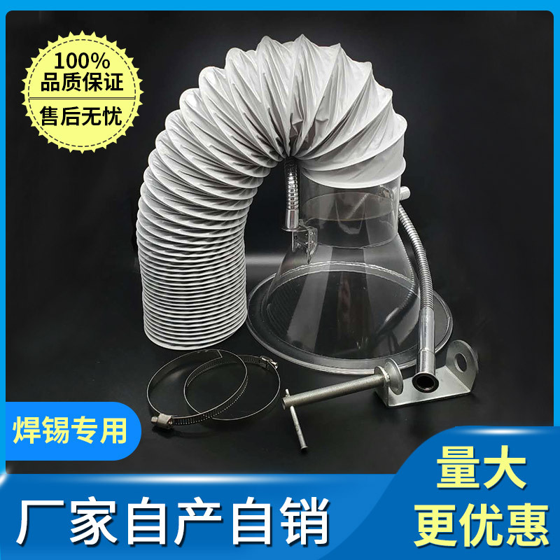 1、电子工厂等:生产线上长方型或圆型抽风排烟风管,于每个工作点上方开一小圆孔,平时用挡板封闭之烟罩连接支管及座,固定于风管侧面或下方。下方技术员需焊锡及抽烟时,将整组附风量调整开关之焊锡抽烟罩之底座锁扣固定于桌面倒吊于任何可固定之点,依焊锡时烟飘之方向配合以最适当之位置及方向,将透明光滑平整之喇叭罩口离焊锡口约10公分承接烟气等排至主排风管或经抽风机排至室外。