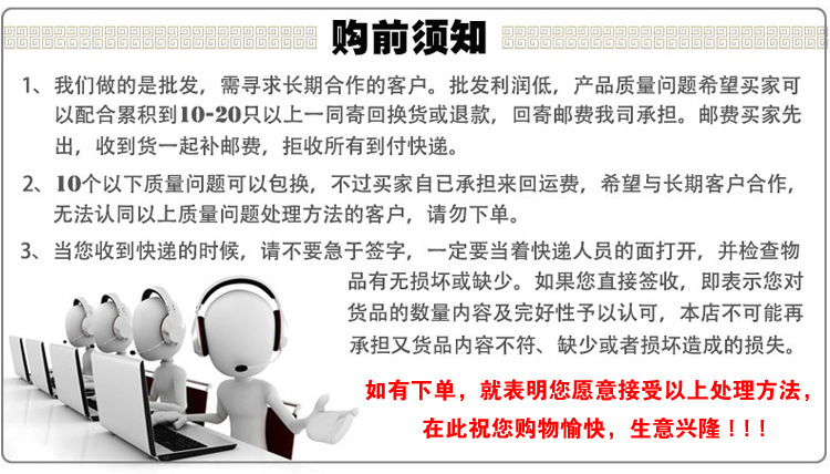 买家须知:以上手表的价格,是不含税的价格。开票另加税点,详细咨询客服!我们做的是批发生意利润微薄,不是淘宝零售,全靠跑量和老顾客维持。每批产品我们都有质量检查,货品没有质量问题才会发货的。如果在运输途中,造成玻璃镜面破碎或者其他质量问题。希望买家能帮忙累积起来,等有质量问题的手表累积到15个以上,再一次性退回换货。寄回来产生的快递费,由我们来承担。但要麻烦买家先帮我们垫付快递费,拒收所有到付快递。15个以下有质量问题的手表,也可以包换,不过来回的快递费要买家自己承担。希望买家可以谅解,谢谢!(在此祝您购物愉快!生意兴隆!!!