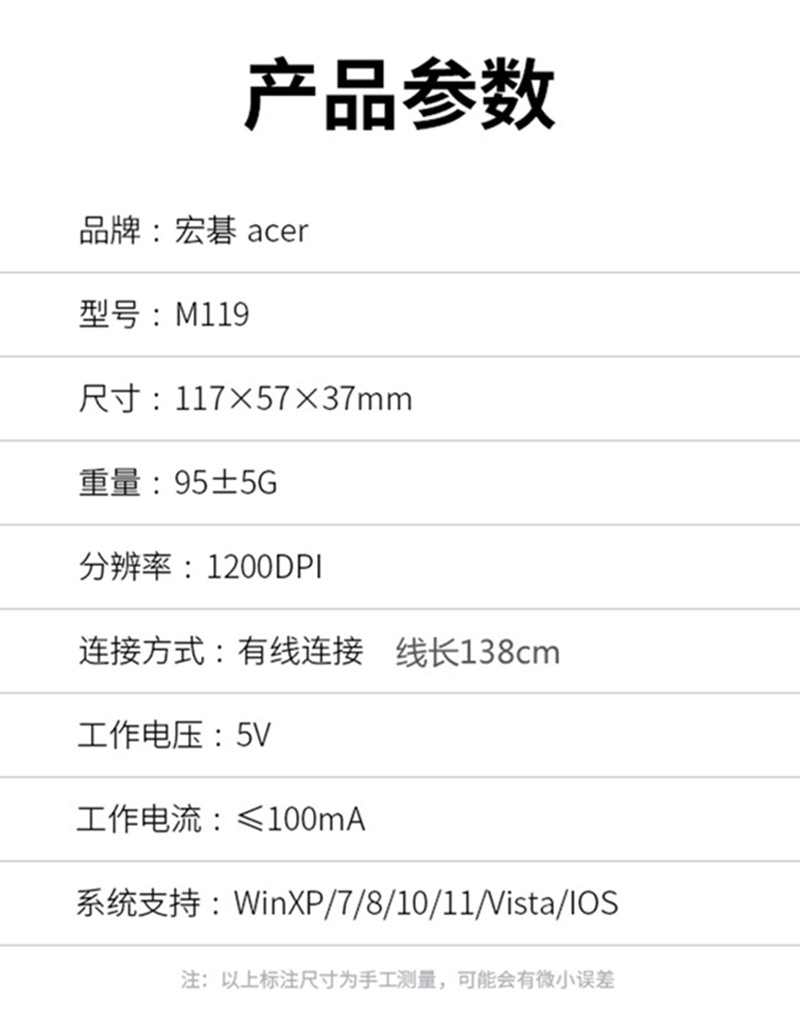 에이서 도매 M119 유선 USB 마우스 노트북 데스크탑 컴퓨터 사무용 비즈니스 가정용 게임용스토어 가기