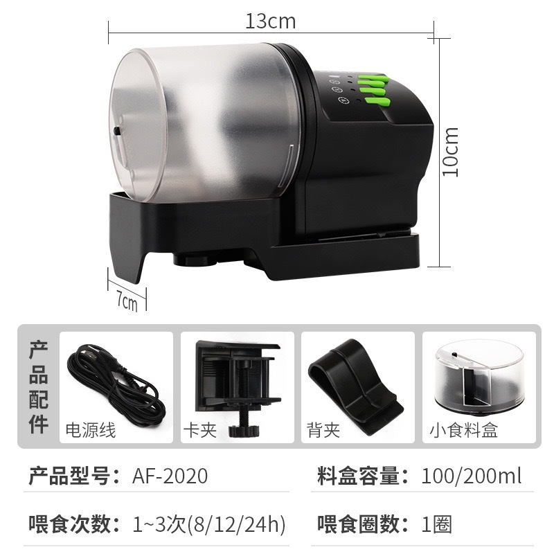数字现示,每天的可喂养次数达4次,可连续自动喂食,可装的饲料达100ml自由设定每次的喂食量大小。