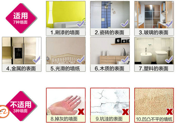 答:可以贴在涂有乳胶漆的墙面、玻璃、瓷砖、冰箱、空调、橱柜、家具等光滑质感的材质表面。(考虑到墙体的差异性,建议特殊材质的墙面或是时间比较久的墙面可以先挑个墙角,用本店免费赠送的试贴纸做一下测试,如没有问题就可以放心贴啦)。千万注意:容易掉墙粉及劣质墙体粘贴后如果出现一切后果由买家自行负责噢!