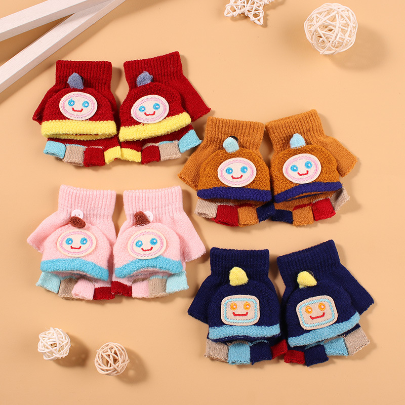 겨울 새로운 만화 남녀 어린이 반 손가락 플립 이중 목적 장갑 캐시미어 니트 따뜻한 장갑 도매스토어 가기