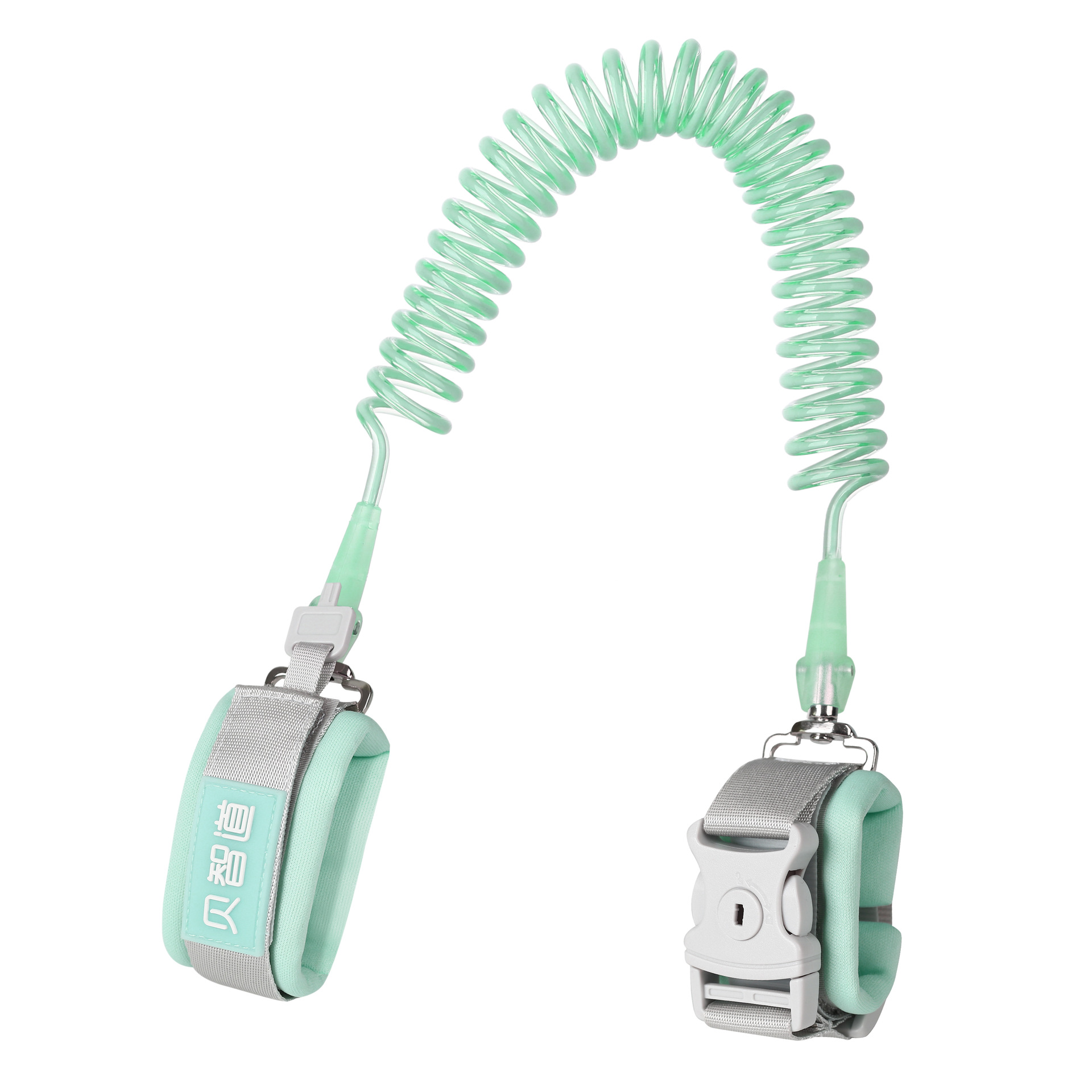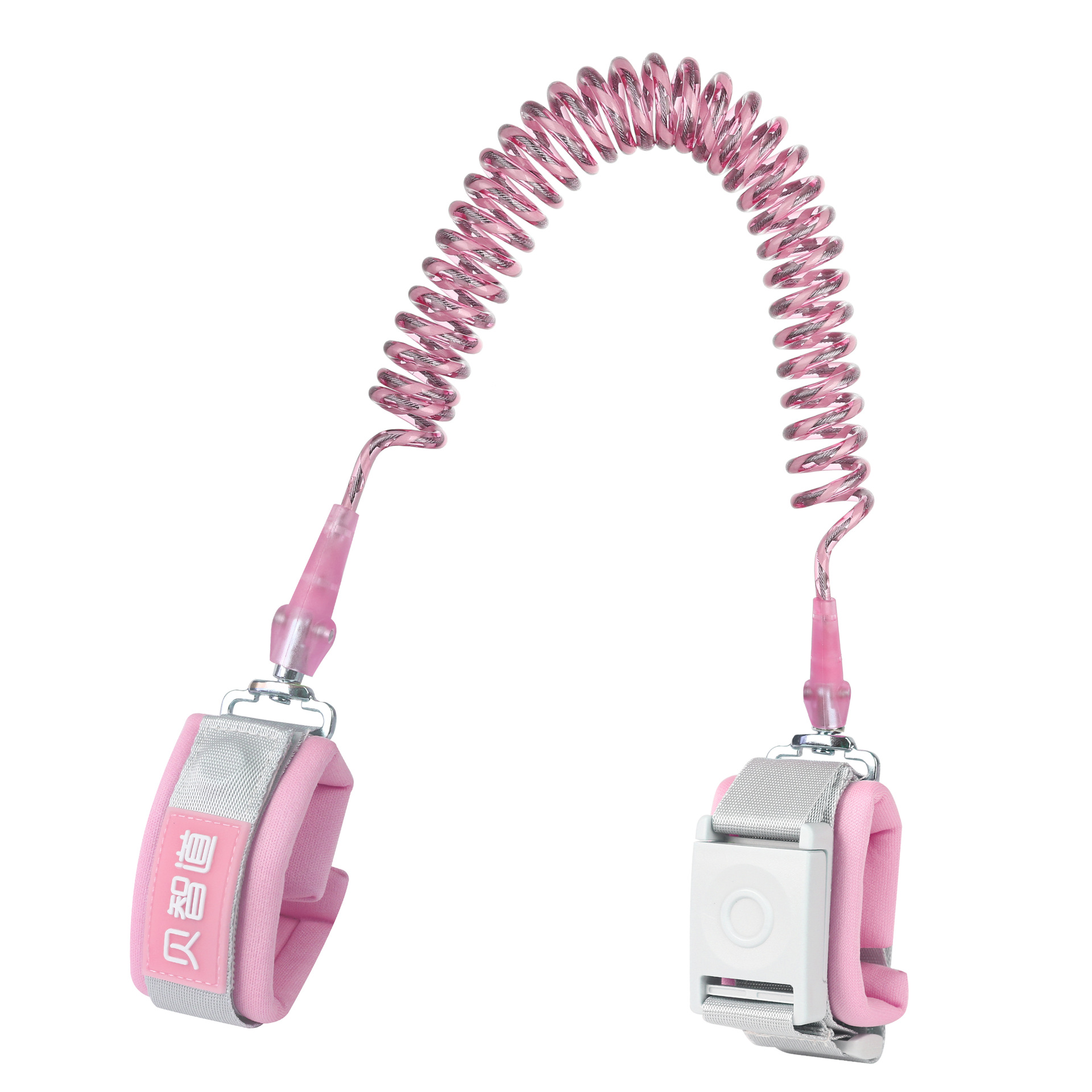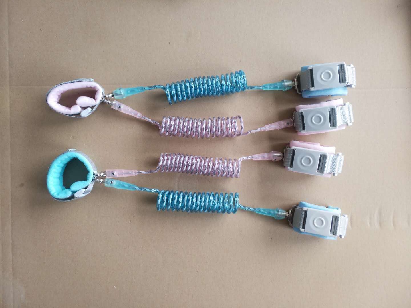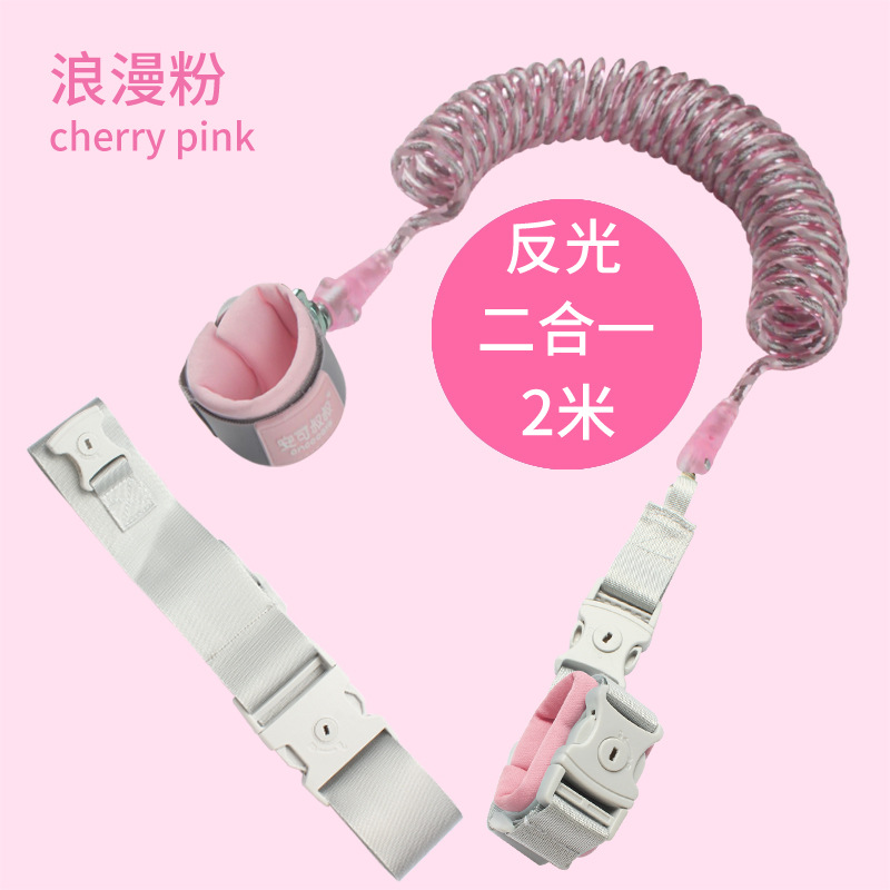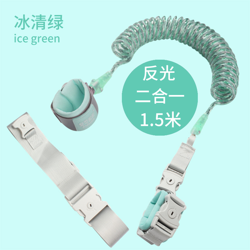 此系列产品目前主推三色:浅蓝、浅粉、浅绿,每色三个规格1.5米、2米、2.5米,锁是钥匙锁、手环和绳了的连接是加宽防剪D形扣,绳子是反光弹簧绳,内置49根钢丝,此款产品钢丝外面又增加了一层反光条,晚上灯光照上去会反射光,行走更安全。