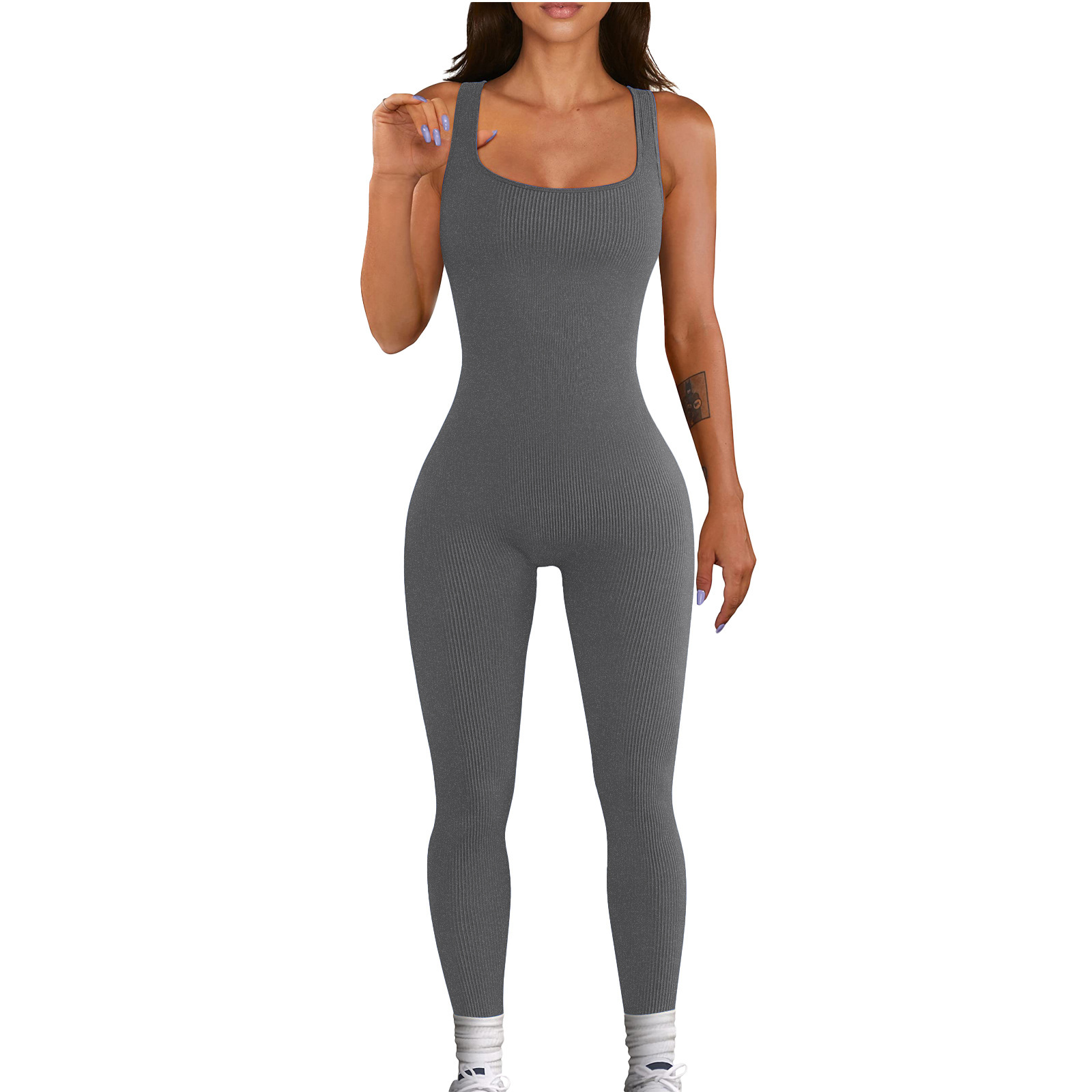 2024 대외 무역 여성 솔리드 컬러 민소매 조끼 점프 수트 스레드 스퀘어 칼라 백리스 힙 슬림 스포츠 점프 수트스토어 가기