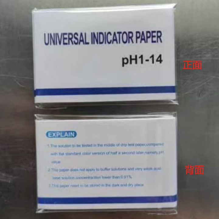 打开试纸的包装袋露出黄色的条状纸片,纸片为pH试纸,盒子表面有1-14种色卡,此色卡为pH标准色卡;
