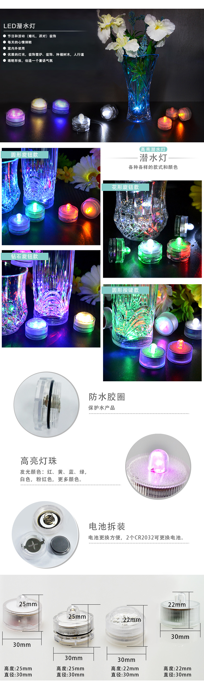 미니 수중 다이빙 라이트 라운드 CR2032 버튼 셀 장식 노브 다이빙 라이트 led 다이빙 캔들 라이트