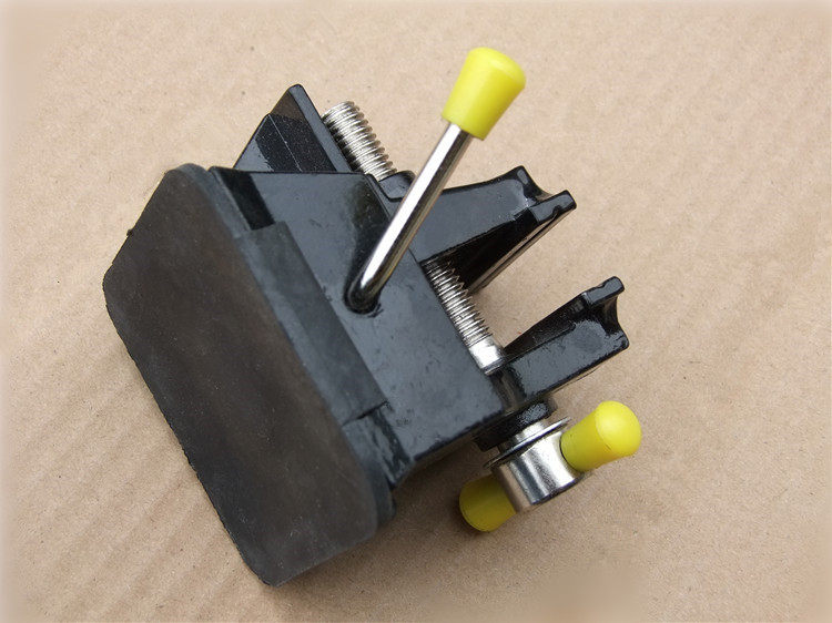 吸式夹具,转动摇杆,台钳可固定在光滑或者平整的桌面上,是玻璃或者瓷砖,吸附时请将下面的塑胶卡槽与金属底盘卡好,并、连续扳动吸附手柄到吸紧为止。
