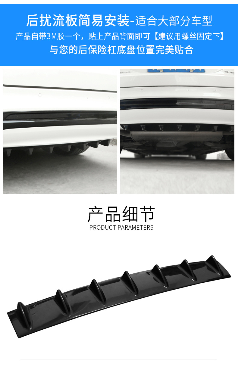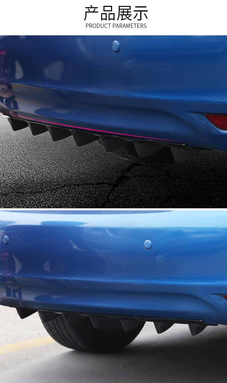 【产品说明】:改装后扰流板,不仅可以改善后保险杠的立体感,也可以在行驶过程中减少气流的阻力。