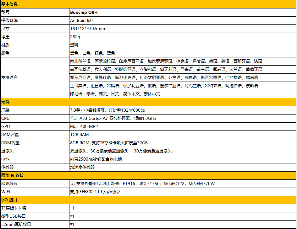 Boxchip Q8H WiFi平板电脑7英寸双摄像头四核