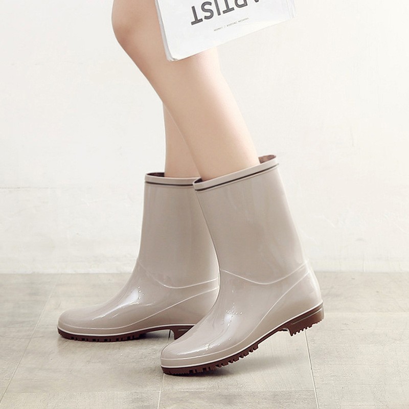 수출 일본 미드 튜브 여성용 미끄럼 방지 레인 슈즈 PVC 밝은 얼굴 스트로크 패션 방수 레인 슈즈 패션 워터 슈즈 외부 착용