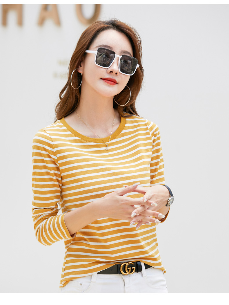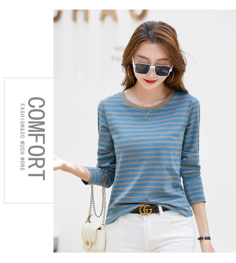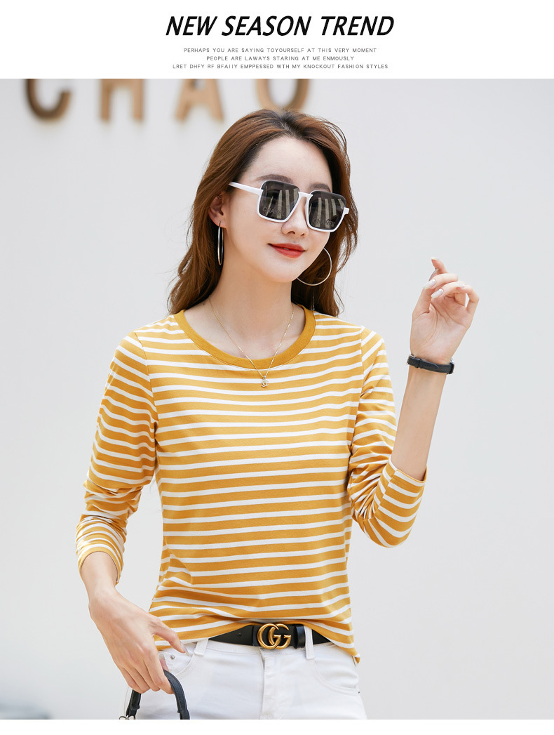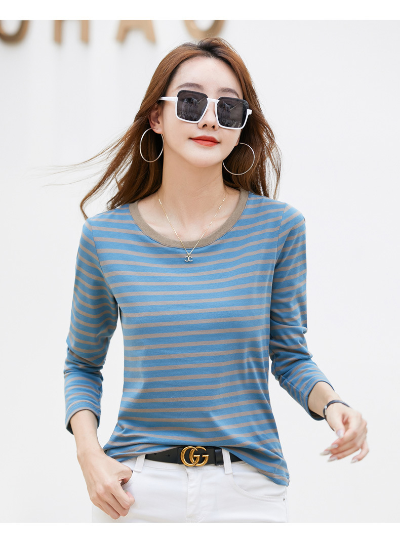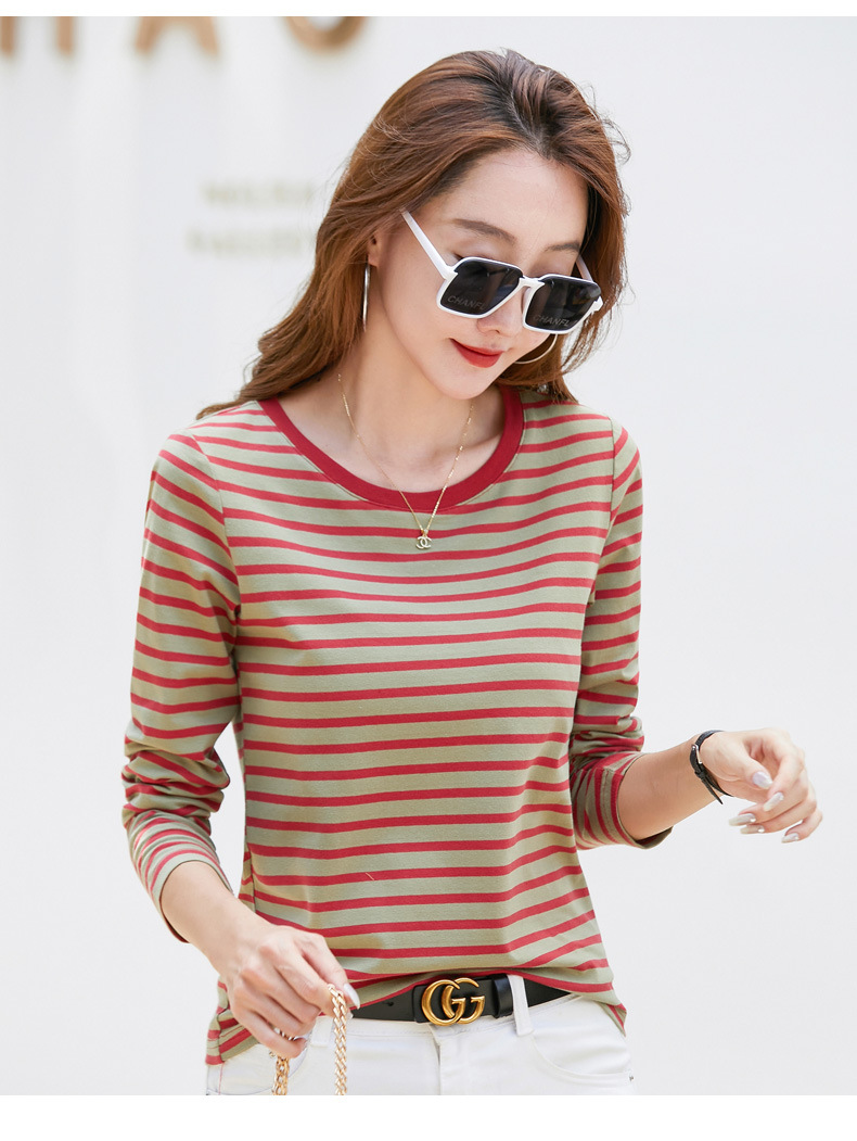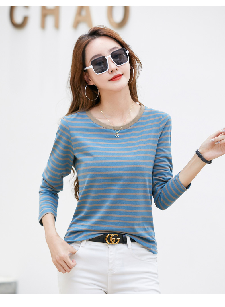 367 스트라이프 라운드넥 긴팔 여성 티셔츠 가을 겨울 다용도 한국 스타일 신선한 레트로 티셔츠 초가을 상의 트렌디