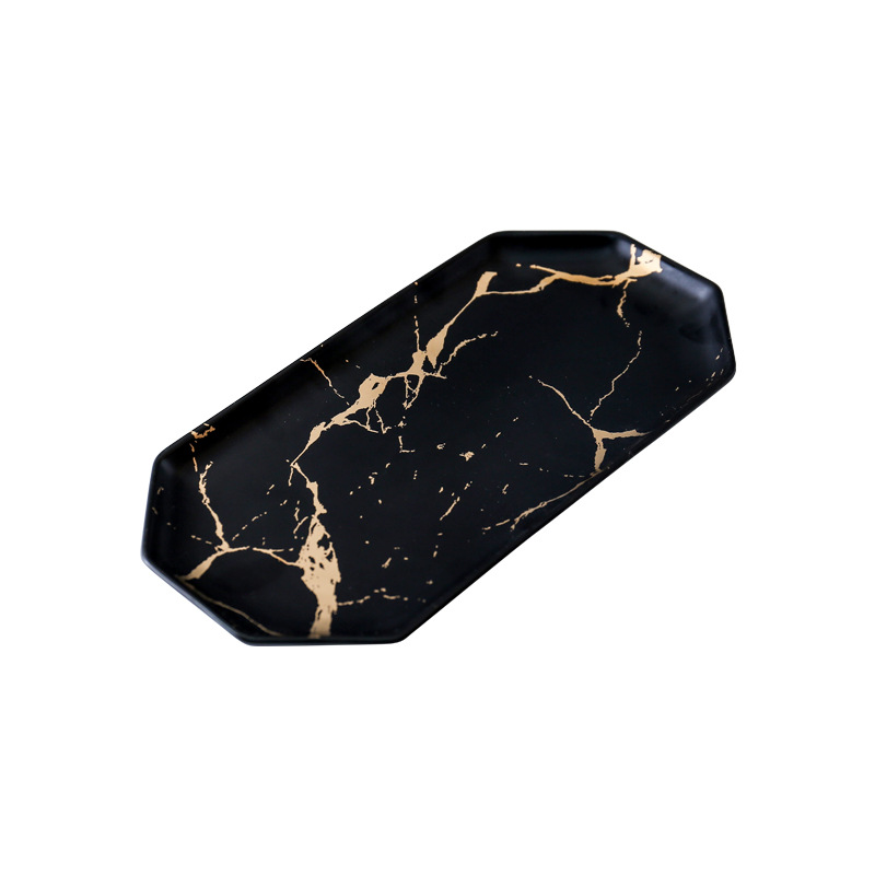 【品名】:哑光黑白色大理石纹金餐具餐盘