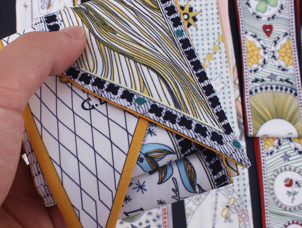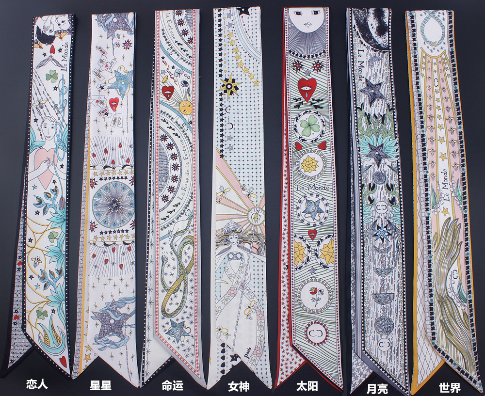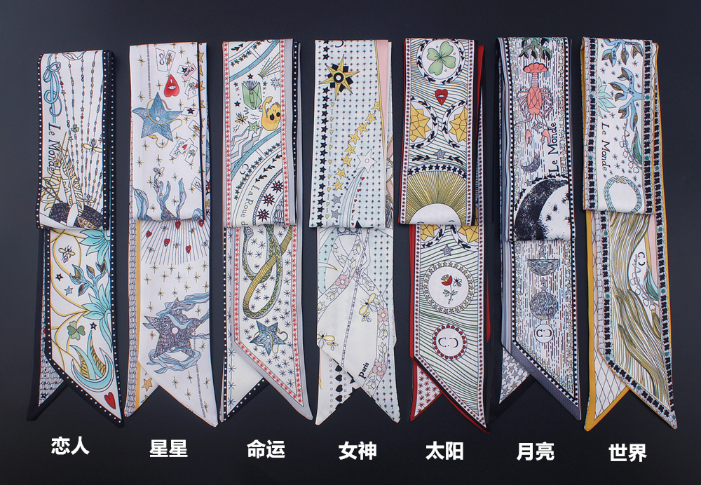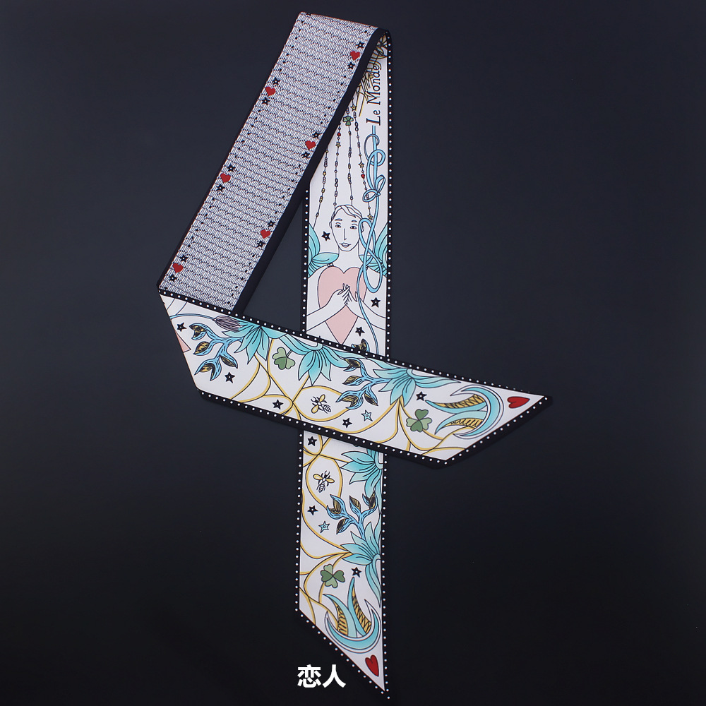 타로 시리즈 양면 인쇄 능직물 실크 타이 백 핸들 스카프 슬림 좁은 리본 스카프 여성용스토어 가기