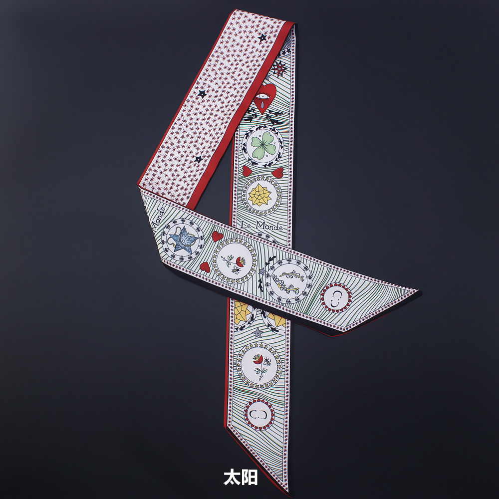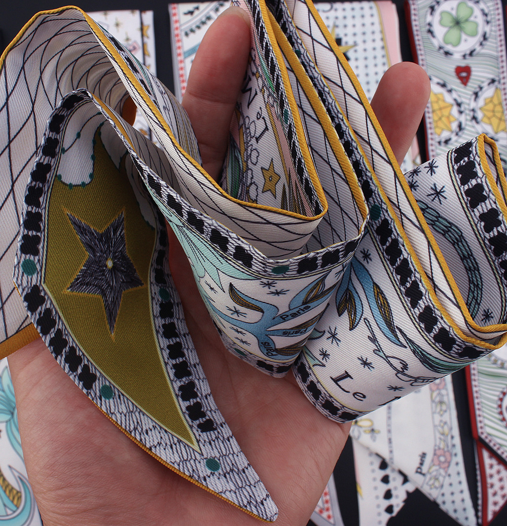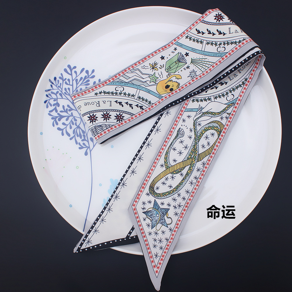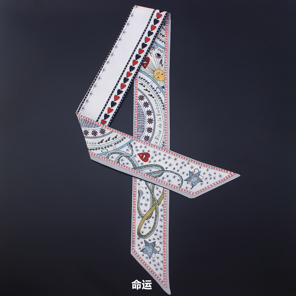타로 시리즈 양면 인쇄 능직물 실크 타이 백 핸들 스카프 슬림 좁은 리본 스카프 여성용